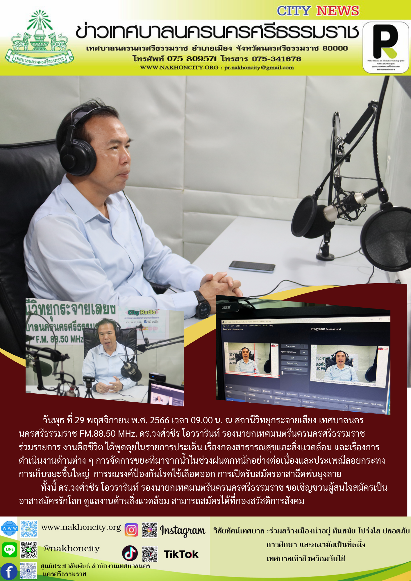 | วันพุธ ที่ 29 พฤศจิกายน พ.ศ. 2566 เวลา 09.00 น. ณ สถานีวิทยุกระจายเสียง เทศบาลนครนครศรีธรรมราช FM.88.50 MHz. ดร.วงศ์วชิร โอวรารินท์ รองนายกเทศมนตรีนครนครศรีธรรมราช ร่วมรายการ งานคือชีวิต ได้พูดคุยในรายการประเด็น เรื่องกองสาธารณสุขและสิ่งแวดล้อม และเรื่องการดำเนินงานด้านต่าง ๆ การจัดการขยะที่มาจากน้ำในช่วงฝนตกหนักอย่างต่อเนื่องและประเพณีลอยกระทง การเก็บขยะชิ้นใหญ่ การรณรงค์ป้องกันโรคไข้เลือดออก การเปิดรับสมัครอาสาฉีดพ่นยุงลาย ทั้งนี้ ดร.วงศ์วชิร โอวรารินท์ รองนายกเทศมนตรีนครนครศรีธรรมราช ขอเชิญชวนผู้สนใจสมัครเป็น อาสาสมัครรักโลก ดูแลงานด้านสิ่งแวดล้อม สามารถสมัครได้ที่กองสวัสดิการสังคม |