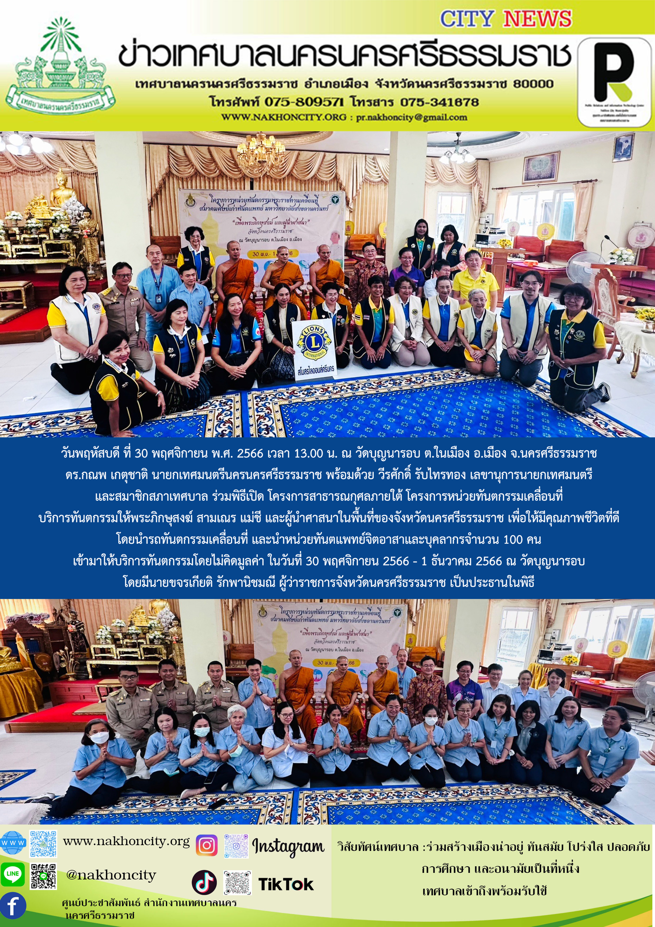 | ดร.กณพ เกตุชาติ นายกเทศมนตรีนครนครศรีธรรมราช ร่วมพิธีเปิด โครงการสาธารณกุศลภายใต้โครงการหน่วยทันตกรรมเคลื่อนที่ บริการทันตกรรมให้พระภิกษุสงฆ์ สามเณร แม่ชี และผู้นำศาสนาในพื้นที่ของจังหวัดนครศรีธรรมราช |