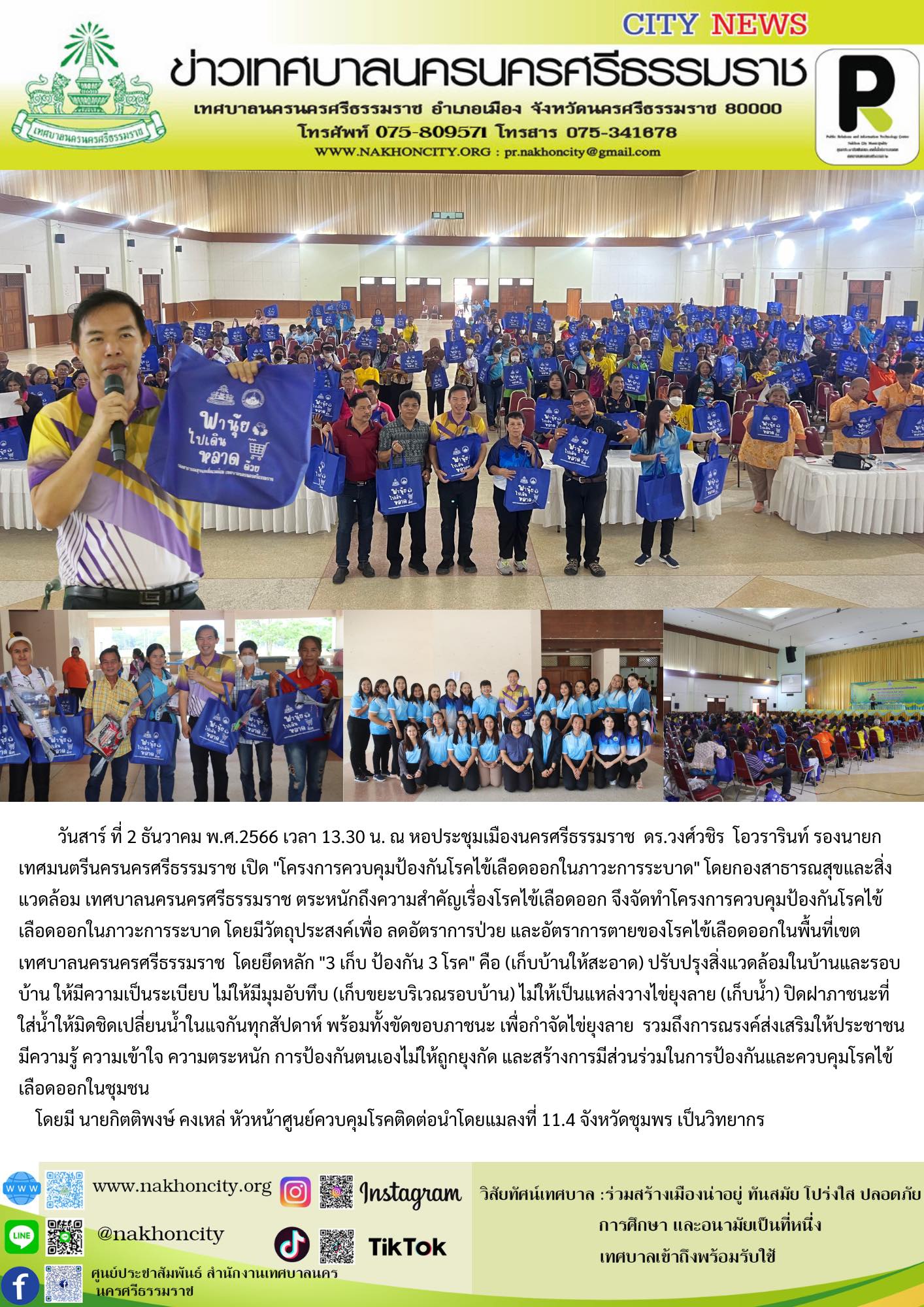 | วันเสาร์ ที่ 2 ธันวาคม พ.ศ.2566 เวลา 13.30 น. ณ หอประชุมเมืองนครศรีธรรมราช ดร.วงศ์วชิร โอวรารินท์ รองนายกเทศมนตรีนครนครศรีธรรมราช เปิด "โครงการควบคุมป้องกันโรคไข้เลือดออกในภาวะการระบาด" โดยกองสาธารณสุขและสิ่งแวดล้อม เทศบาลนครนครศรีธรรมราช ตระหนักถึงความสำคัญเรื่องโรคไข้เลือดออก จึงจัดทำโครงการควบคุมป้องกันโรคไข้เลือดออกในภาวะการระบาด โดยมีวัตถุประสงค์เพื่อ ลดอัตราการป่วย และอัตราการตายของโรคไข้เลือดออกในพื้นที่เขตเทศบาลนครนครศรีธรรมราช โดยยึดหลัก "3 เก็บ ป้องกัน 3 โรค" คือ (เก็บบ้านให้สะอาด) ปรับปรุงสิ่งแวดล้อมในบ้านและรอบบ้าน ให้มีความเป็นระเบียบ ไม่ให้มีมุมอับทึบ (เก็บขยะบริเวณรอบบ้าน) ไม่ให้เป็นแหล่งวางไข่ยุงลาย (เก็บน้ำ) ปิดฝาภาชนะที่ใส่น้ำให้มิดชิดเปลี่ยนน้ำในแจกันทุกสัปดาห์ พร้อมทั้งขัดขอบภาชนะ เพื่อกำจัดไข่ยุงลาย รวมถึงการณรงค์ส่งเสริมให้ประชาชนมีความรู้ ความเข้าใจ ความตระหนัก การป้องกันตนเองไม่ให้ถูกยุงกัด และสร้างการมีส่วนร่วมในการป้องกันและควบคุมโรคไข้เลือดออกในชุมชน โดยมี นายกิตติพงษ์ คงเหล่ หัวหน้าศูนย์ควบคุมโรคติดต่อนำโดยแมลงที่ 11.4 จังหวัดชุมพร เป็นวิทยากร |