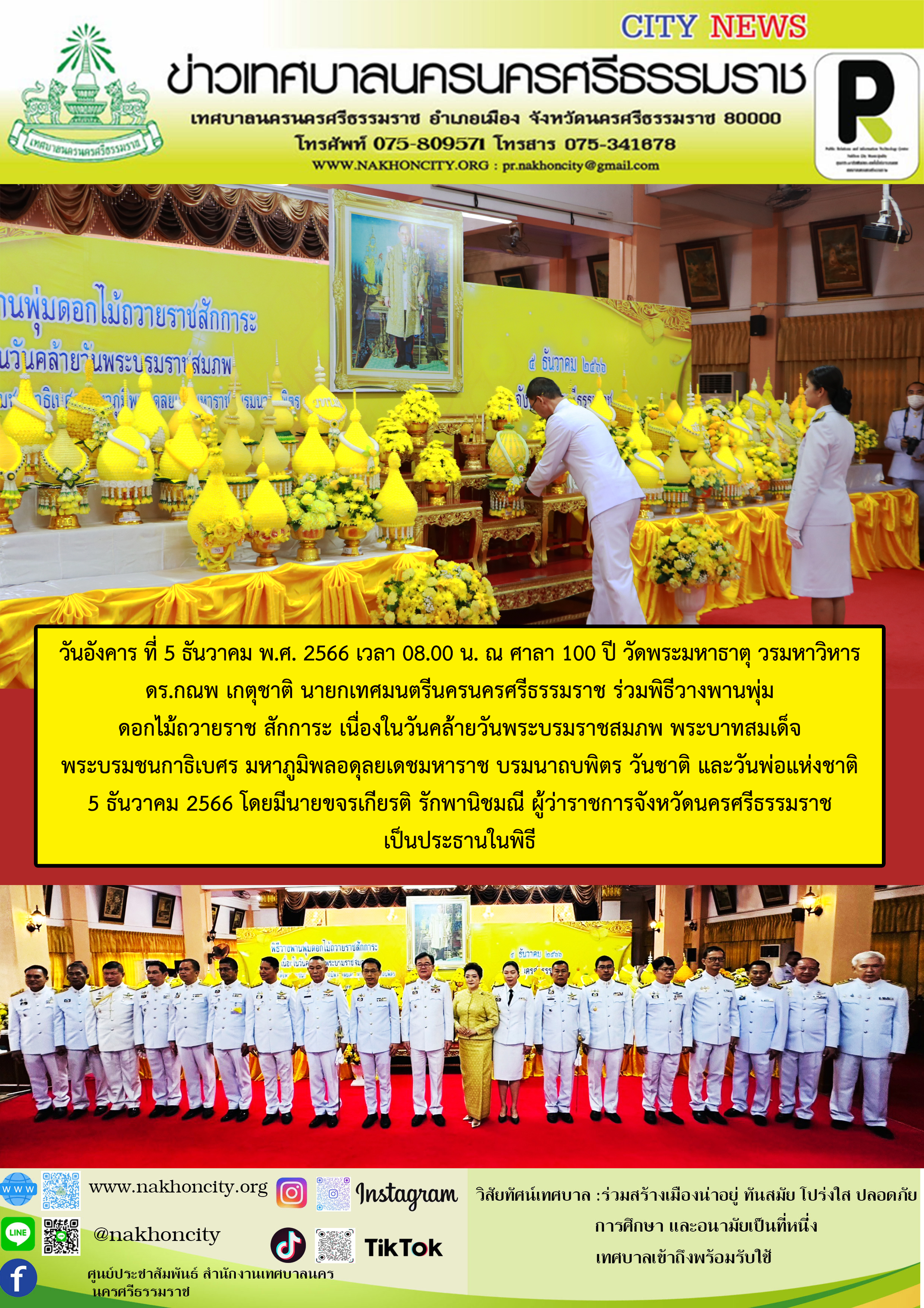 | ดร.กณพ เกตุชาติ นายกเทศมนตรีนครนครศรีธรรมราช ร่วมพิธีวางพานพุ่มดอกไม้ถวายราช สักการะ เนื่องในวันคล้ายวันพระบรมราชสมภพ พระบาทสมเด็จพระบรมชนกาธิเบศร มหาภูมิพลอดุลยเดชมหาราช บรมนาถบพิตร วันชาติ และวันพ่อแห่งชาติ 5 ธันวาคม 2566 |