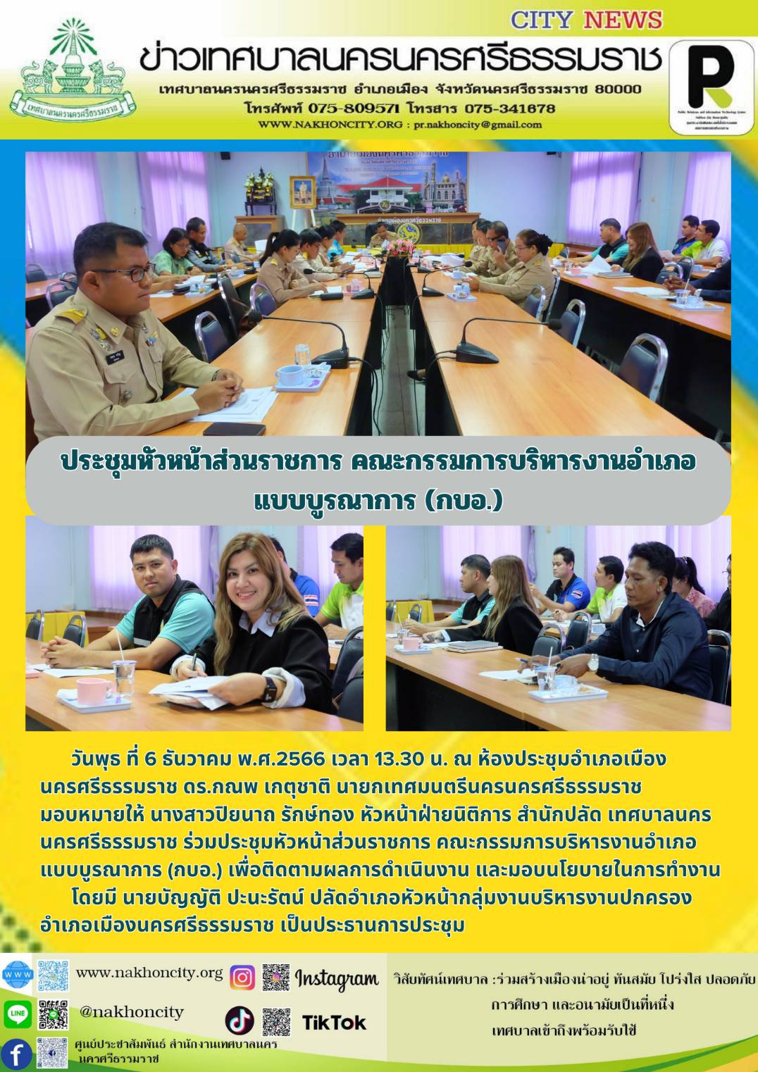 | วันพุธ ที่ 6 ธันวาคม พ.ศ.2566 เวลา 13.30 น. ณ ห้องประชุมอำเภอเมืองนครศรีธรรมราช ดร.กณพ เกตุชาติ นายกเทศมนตรีนครนครศรีธรรมราช มอบหมายให้ นางสาวปิยนาถ รักษ์ทอง หัวหน้าฝ่ายนิติการ สำนักปลัด เทศบาลนครนครศรีธรรมราช ร่วมประชุมหัวหน้าส่วนราชการ คณะกรรมการบริหารงานอำเภอแบบบูรณาการ (กบอ.) เพื่อติดตามผลการดำเนินงาน และมอบนโยบายในการทำงาน  |