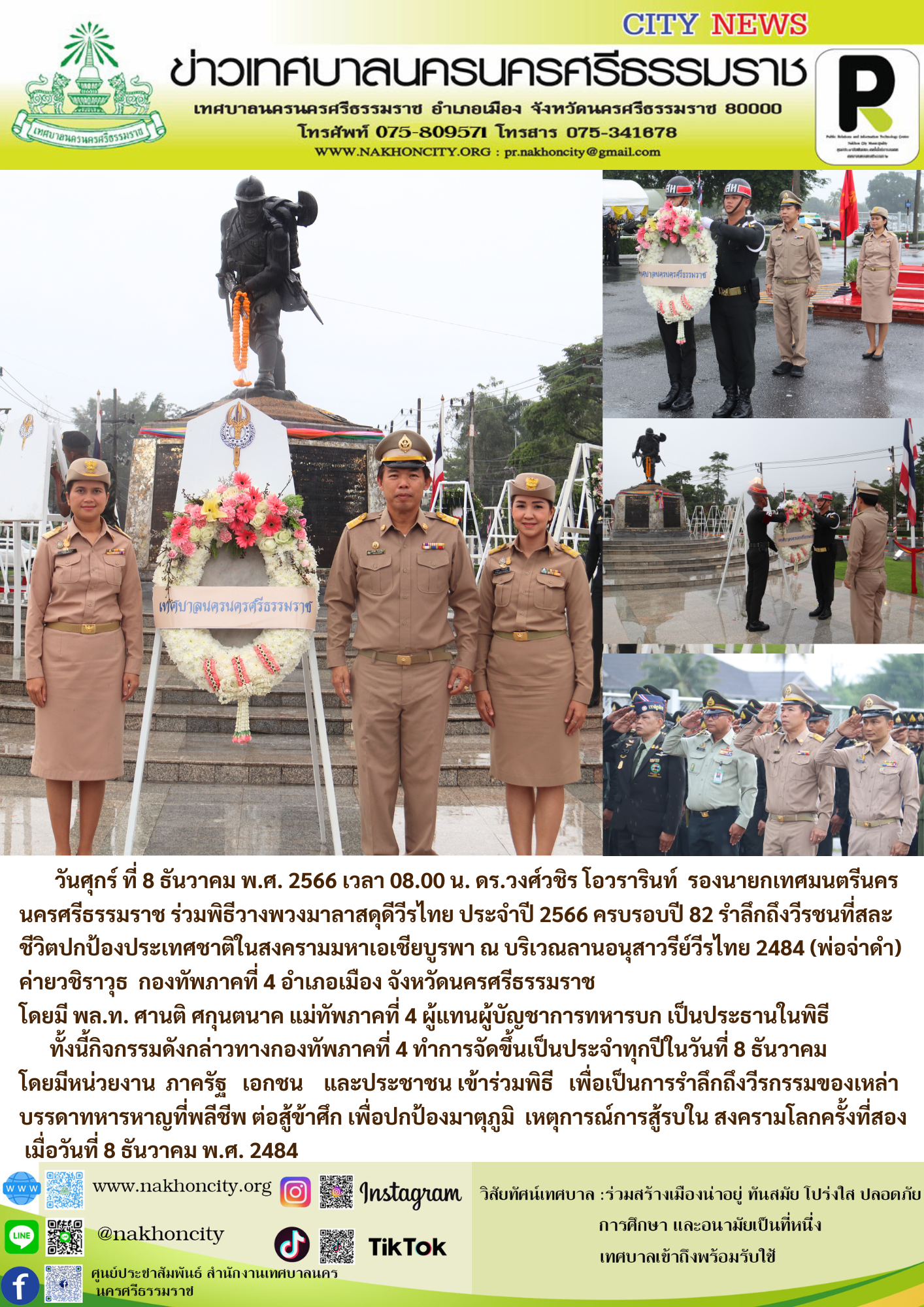 | วันศุกร์ ที่ 8 ธันวาคม พ.ศ. 2566 เวลา 08.00 น. ดร.วงศ์วชิร โอวรารินท์  รองนายกเทศมนตรีนครนครศรีธรรมราช ร่วมพิธีวางพวงมาลาสดุดีวีรไทย ประจำปี 2566 ครบรอบปี 82 รำลึกถึงวีรชนที่สละชีวิตปกป้องประเทศชาติในสงครามมหาเอเชียบูรพา ณ บริเวณลานอนุสาวรีย์วีรไทย 2484 (พ่อจ่าดำ) ค่ายวชิราวุธ  กองทัพภาคที่ 4 อำเภอเมือง จังหวัดนครศรีธรรมราช  โดยมี พล.ท. ศานติ ศกุนตนาค แม่ทัพภาคที่ 4 ผู้แทนผู้บัญชาการทหารบก เป็นประธานในพิธี |