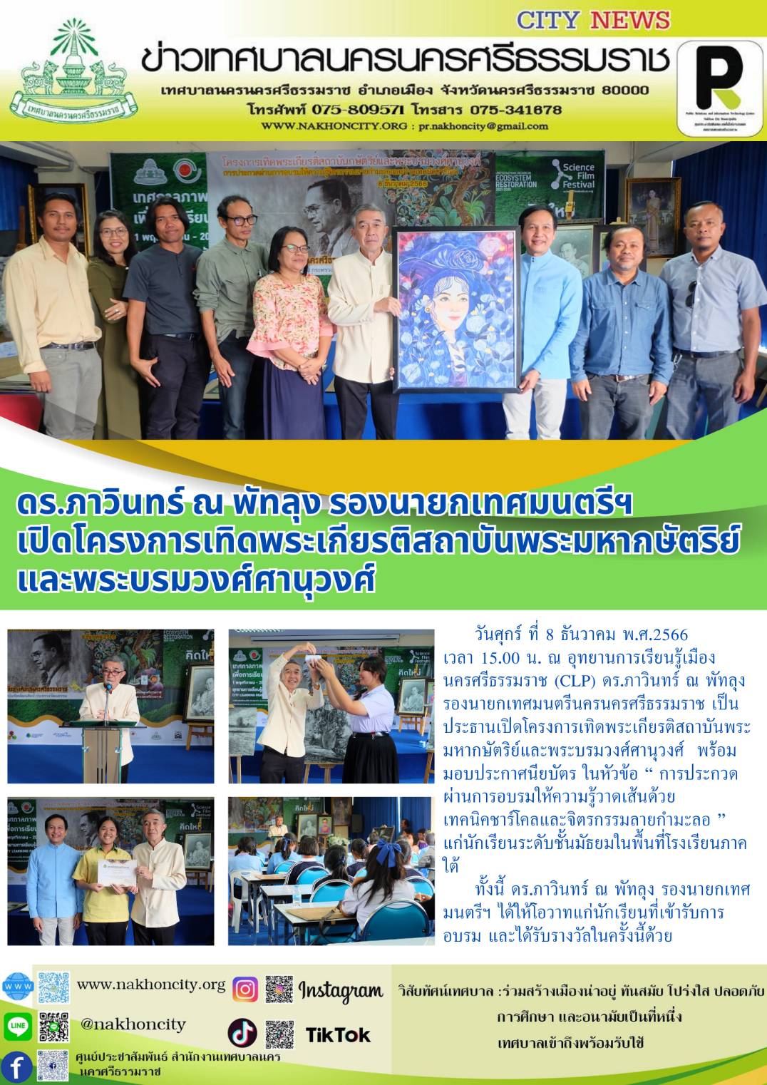 | ดร.ภาวินทร์ ณ พัทลุง รองนายกเทศมนตรีนครนครศรีธรรมราช เป็นประธานเปิดโครงการเทิดพระเกียรติสถาบันพระมหากษัตริย์และพระบรมวงศ์ศานุวงศ์ พร้อมมอบประกาศนียบัตร |