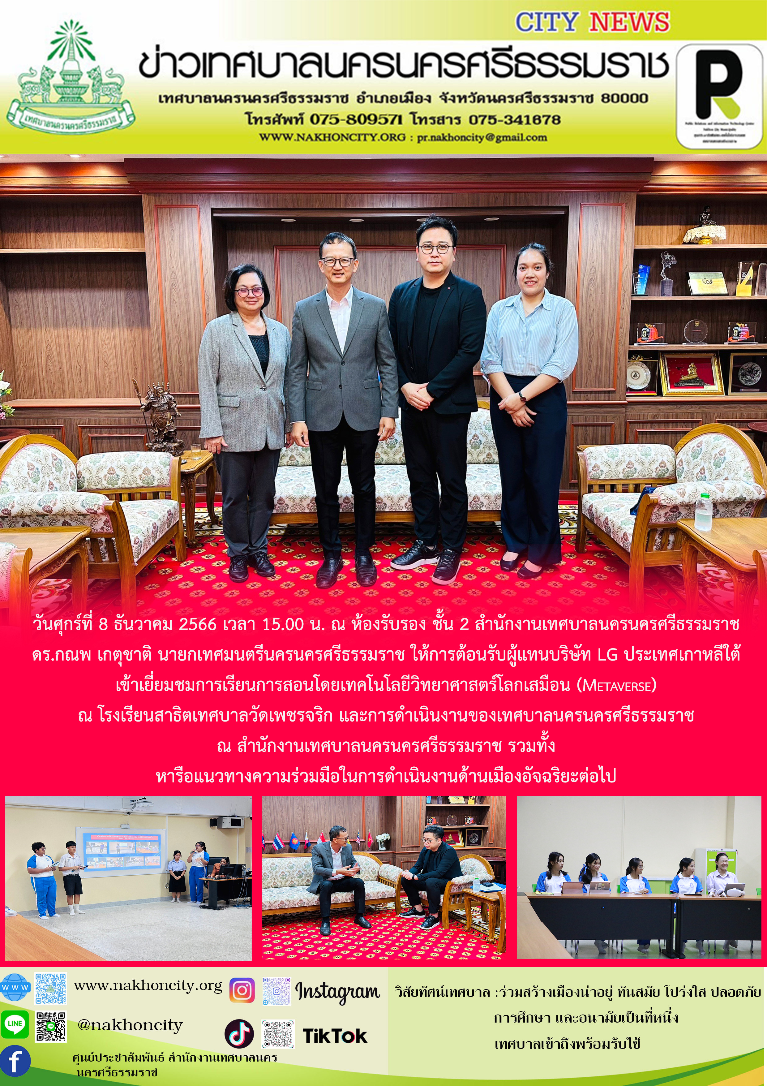 | ดร.กณพ เกตุชาติ นายกเทศมนตรีนครนครศรีธรรมราช ให้การต้อนรับผู้แทนบริษัท LG ประเทศเกาหลีใต้ เข้าเยี่ยมชมการเรียนการสอนโดยเทคโนโลยีวิทยาศาสตร์โลกเสมือน (Metaverse) ณ โรงเรียนสาธิตเทศบาลวัดเพชรจริก และการดำเนินงานของเทศบาลนครนครศรีธรรมราช ณ สำนักงานเทศบาลนครนครศรีธรรมราช รวมทั้งหารือแนวทางความร่วมมือในการดำเนินงานด้านเมืองอัจฉริยะต่อไป |