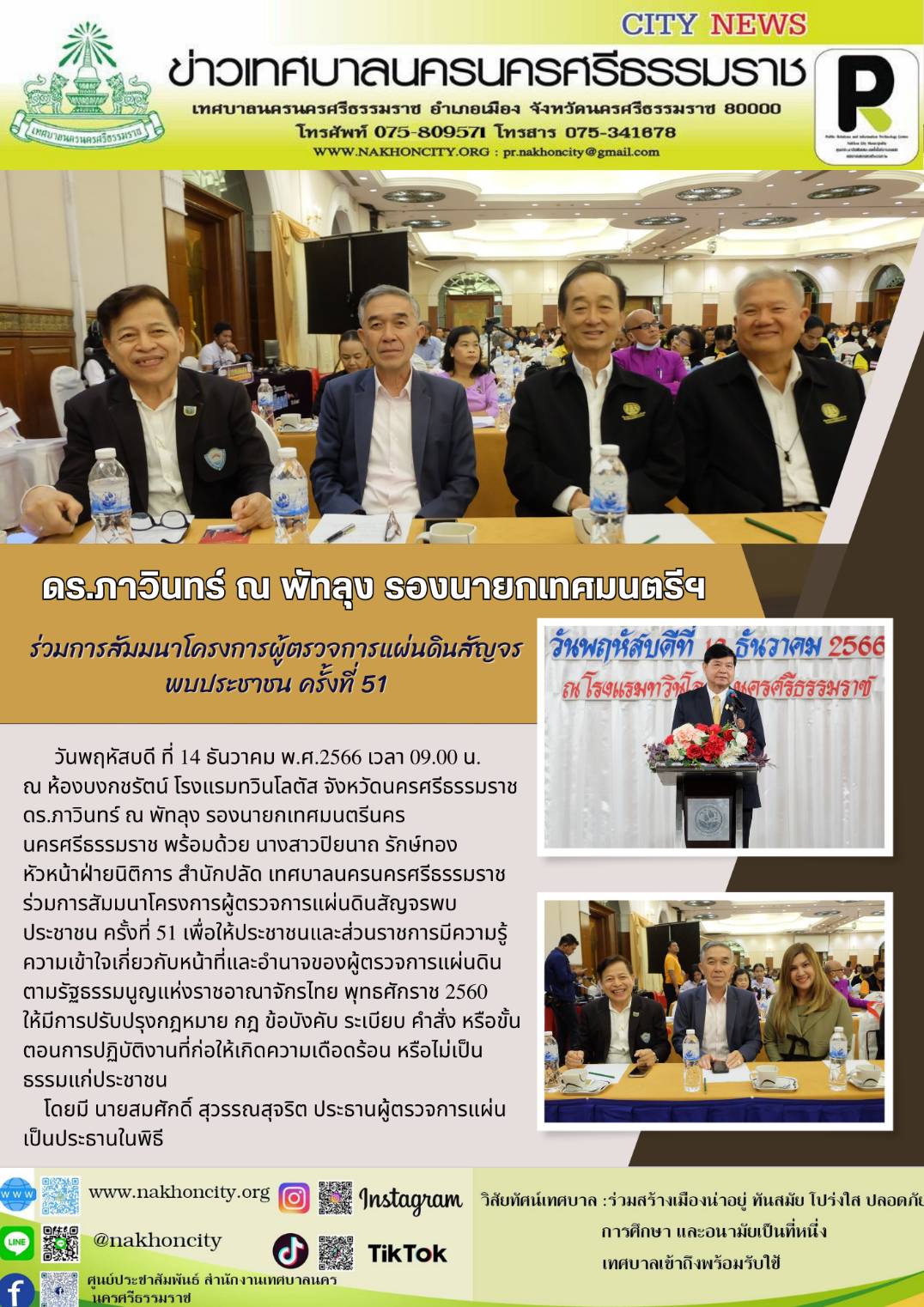 | ดร.ภาวินทร์ ณ พัทลุง รองนายกเทศมนตรีนครนครศรีธรรมราช พร้อมด้วย นางสาวปิยนาถ รักษ์ทอง หัวหน้าฝ่ายนิติการ สำนักปลัด เทศบาลนครนครศรีธรรมราช ร่วมการสัมมนาโครงการผู้ตรวจการแผ่นดินสัญจรพบประชาชน ครั้งที่ 51 |