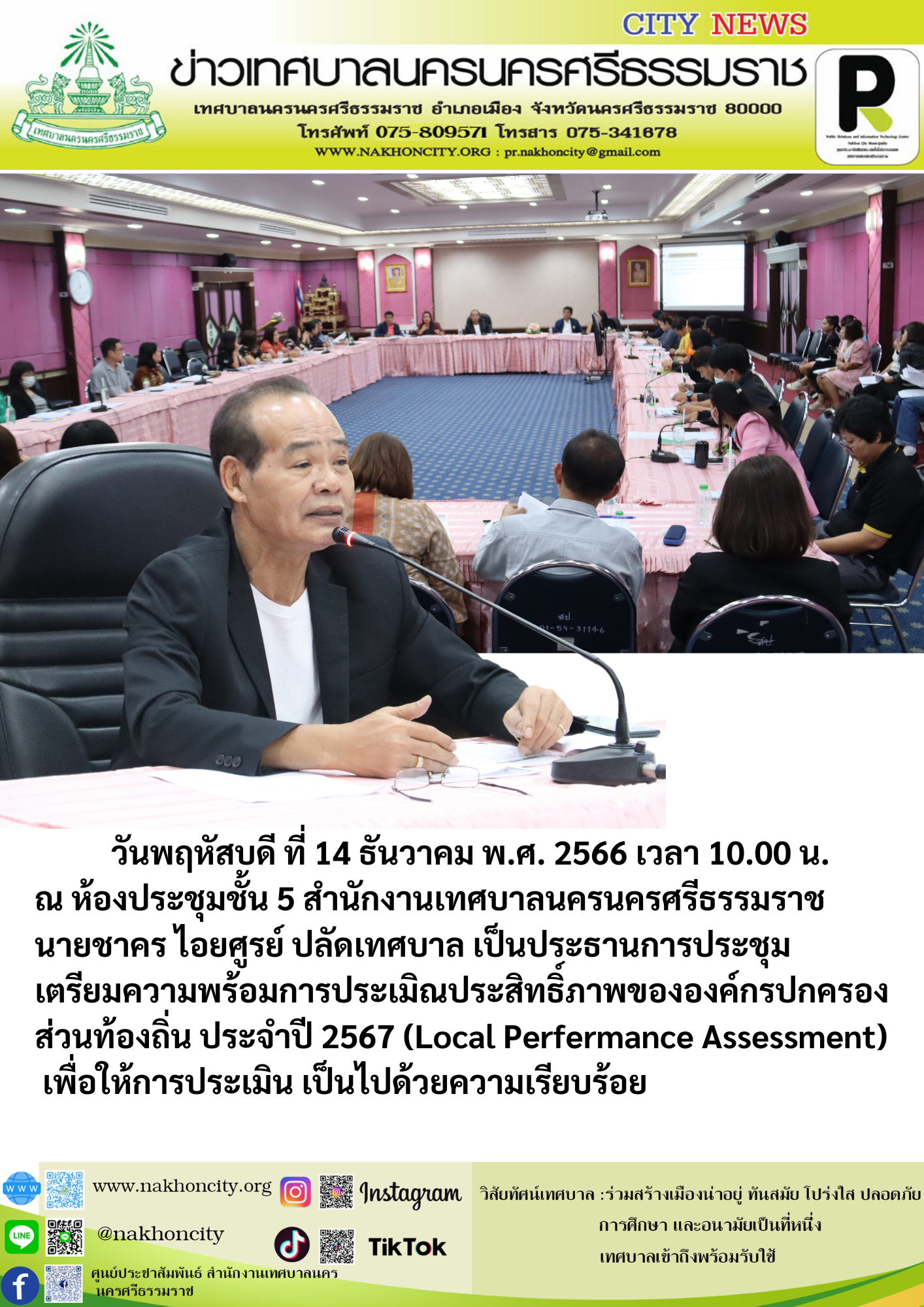 | วันพฤหัสบดี ที่ 14 ธันวาคม พ.ศ. 2566 เวลา 10.00 น. ณ ห้องประชุมชั้น 5 สำนักงานเทศบาลนครนครศรีธรรมราช นายชาคร ไอยศูรย์ ปลัดเทศบาล เป็นประธานการประชุมเตรียมความพร้อมการประเมิณประสิทธิ์ภาพขององค์กรปกครองส่วนท้องถิ่น ประจำปี 2567 (Local Perfermance Assessment) เพื่อให้การประเมิน เป็นไปด้วยความเรียบร้อย |