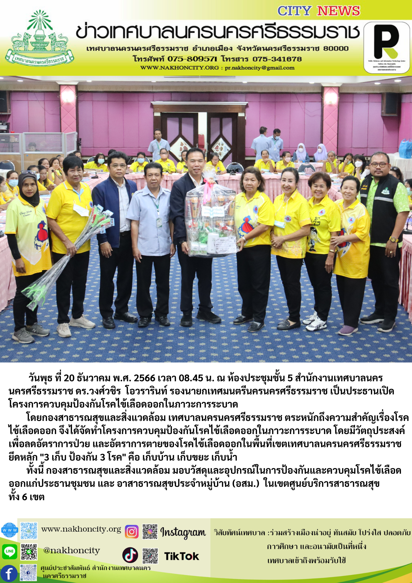 | วันพุธที่ 20 ธันวาคม พ.ศ. 2566 เวลา 08.45 น. ณ ห้องประชุมชั้น 5 สำนักงานเทศบาลนครนครศรีธรรมราช ดร.วงศ์วชิร โอวรารินท์ รองนายกเทศมนตรีนครนครศรีธรรมราช เป็นประธานเปิดโครงการควบคุมป้องกันโรคไข้เลือดออกในภาวะการระบาด โดยกองสาธารณสุขและสิ่งแวดล้อม เทศบาลนครนครศรีธรรมราช ตระหนักถึงความสำคัญเรื่องโรคไข้เลือดออก จึงได้จัดทำโครงการควบคุมป้องกันโรคไข้เลือดออกในภาวะการระบาด โดยมีวัตถุประสงค์เพื่อลดอัตราการป่วย และอัตราการตายของโรคไข้เลือดออกในพื้นที่เขตเทศบาลนครนครศรีธรรมราช ยึดหลัก "3 เก็บ ป้องกัน 3 โรค" คือ เก็บบ้าน เก็บขยะ เก็บน้ำ ทั้งนี้ กองสาธารณสุขและสิ่งแวดล้อม มอบวัสดุและอุปกรณ์ในการป้องกันและควบคุมโรคไข้เลือดออกแก่ประธานชุมชน และ อาสาธารณสุขประจำหมู่บ้าน (อสม.) ในเขตศูนย์บริการสาธารณศุข ทั้ง 6 เขต |