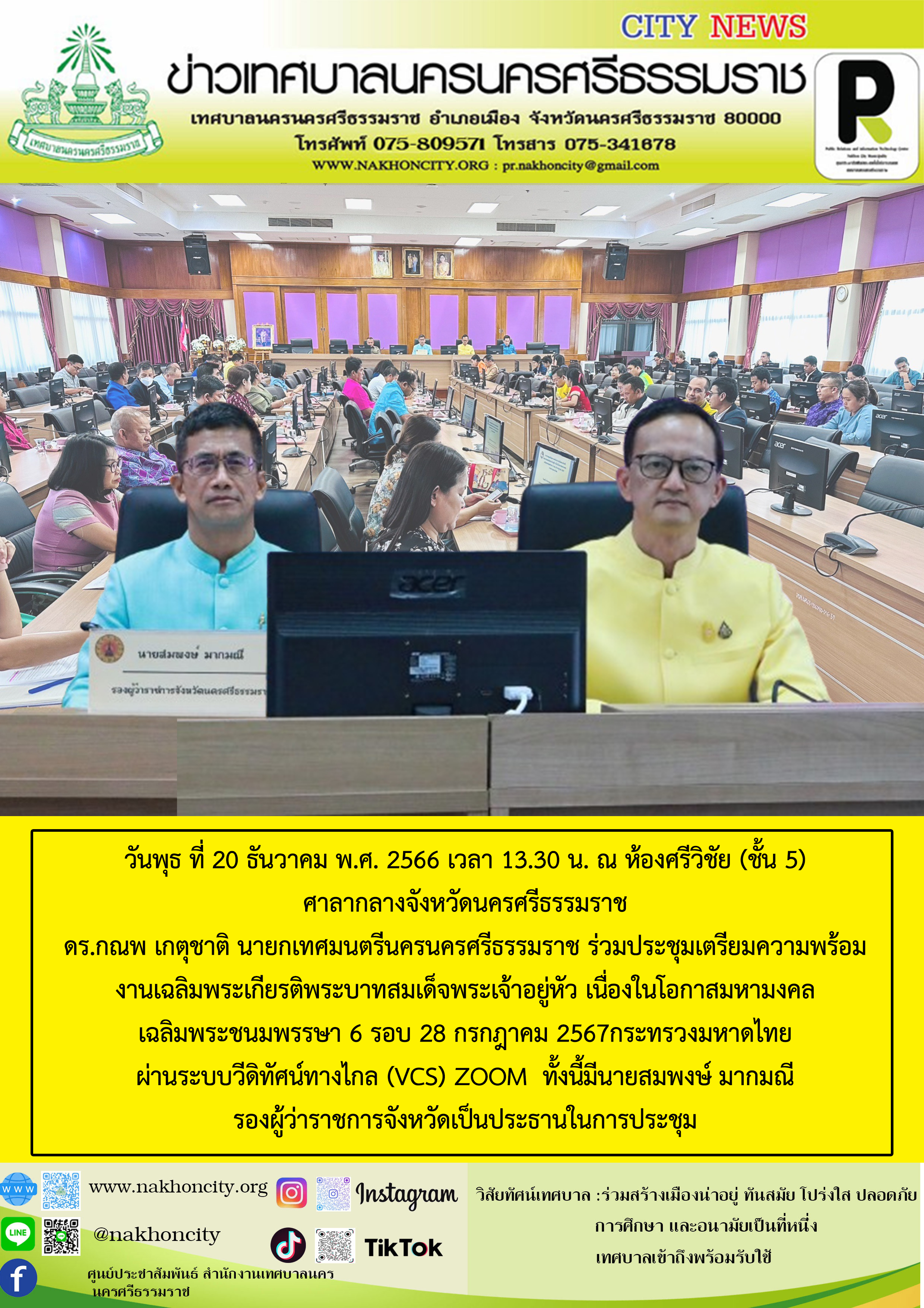 | ดร.กณพ เกตุชาติ นายกเทศมนตรีนครนครศรีธรรมราช ร่วมประชุมเตรียมความพร้อมงานเฉลิมพระเกียรติ พระบาทสมเด็จพระเจ้าอยู่หัว เนื่องในโอกาสมหามงคล เฉลิมพระชนมพรรษา 6 รอบ 28 กรกฎาคม 2567 |