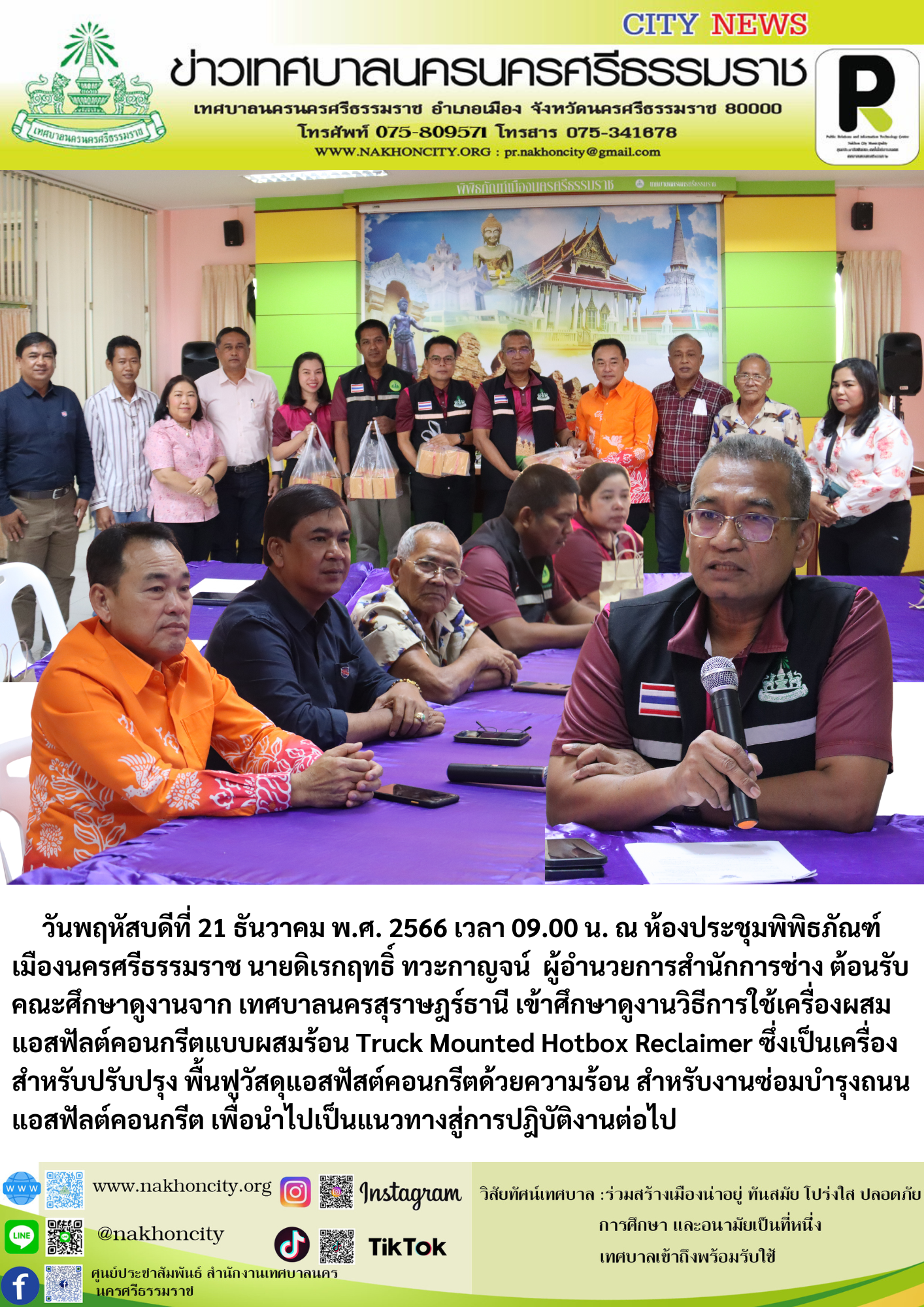 | วันพฤหัสบดีที่ 21 ธันวาคม พ.ศ. 2566 เวลา 09.00 น. ณ ห้องประชุมพิพิธภัณฑ์เมืองนครศรีธรรมราช นายดิเรกฤทธิ์ ทวะกาญจน์ ผู้อำนวยการสำนักการช่าง ต้อนรับคณะศึกษาดูงานจาก เทศบาลนครสุราษฎร์ธานี เข้าศึกษาดูงานวิธีการใช้เครื่องผสมแอสฟัลต์คอนกรีตแบบผสมร้อน Truck Mounted Hotbox Reclaimer ซึ่งเป็นเครื่องสำหรับปรับปรุง พื้นฟูวัสดุแอสฟัสต์คอนกรีตด้วยความร้อน สำหรับงานซ่อมบำรุงถนนแอสฟัลต์คอนกรีต เพื่อนำไปเป็นแนวทางสู่การปฎิบัติงานต่อไป |