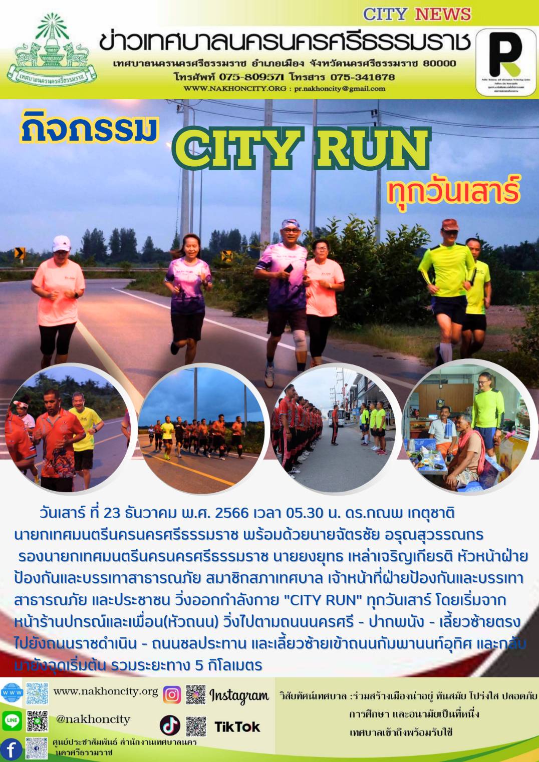 | วันเสาร์ ที่ 23 ธันวาคม พ.ศ. 2566 เวลา 05.30 น. ดร.กณพ เกตุชาติ นายกเทศมนตรีนครนครศรีธรรมราช พร้อมด้วยนายฉัตรชัย อรุณสุวรรณกร รองนายกเทศมนตรีนครนครศรีธรรมราช นายยงยุทธ เหล่าเจริญเกียรติ หัวหน้าฝ่ายป้องกันและบรรเทาสาธารณภัย สมาชิกสภาเทศบาล เจ้าหน้าที่ฝ่ายป้องกันและบรรเทาสาธารณภัย และประชาชน วิ่งออกกำลังกาย "CITY RUN" ทุกวันเสาร์ โดยเริ่มจากหน้าร้านปกรณ์และเพื่อน(หัวถนน) วิ่งไปตามถนนนครศรี - ปากพนัง - เลี้ยวซ้ายตรงไปยังถนนราชดำเนิน - ถนนชลประทาน และเลี้ยวซ้ายเข้าถนนกัมพานนท์อุทิศ และกลับมายังจุดเริ่มต้น รวมระยะทาง 5 กิโลเมตร .............. ภาพ//ข่าว//จันทร์จิรา |