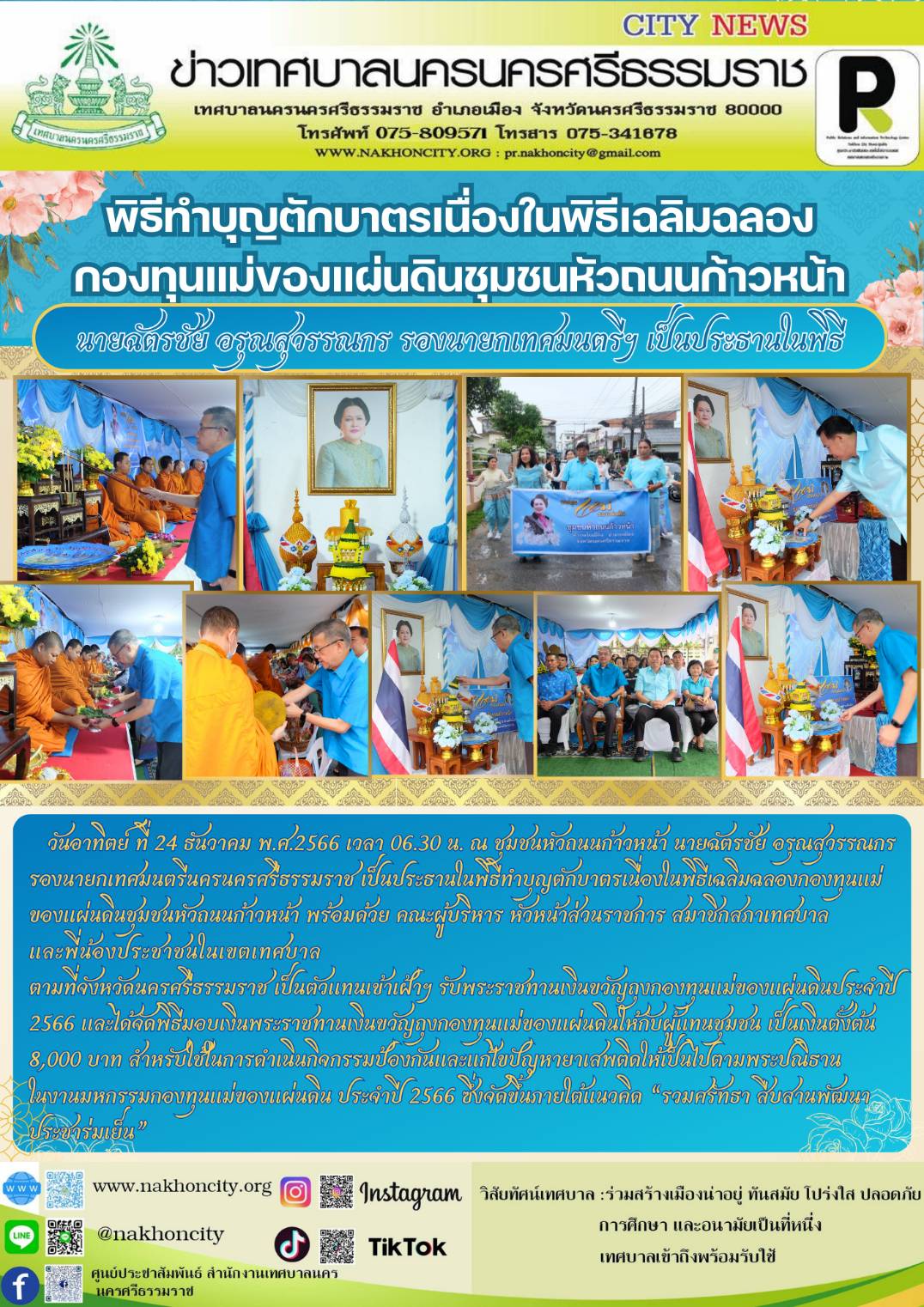 | วันอาทิตย์ ที่ 24 ธันวาคม พ.ศ.2566 เวลา 06.30 น. ณ ชุมชนหัวถนนก้าวหน้า นายฉัตรชัย อรุณสุวรรณกร รองนายกเทศมนตรีนครนครศรีธรรมราช เป็นประธานในพิธีทำบุญตักบาตรเนื่องในพิธีเฉลิมฉลองกองทุนแม่ของแผ่นดินชุมชนหัวถนนก้าวหน้า พร้อมด้วย คณะผู้บริหาร หัวหน้าส่วนราชการ สมาชิกสภาเทศบาล และพี่น้องประชาชนในเขตเทศบาล ตามที่จังหวัดนครศรีธรรมราช เป็นตัวแทนเข้าเฝ้าฯ รับพระราชทานเงินขวัญถุงกองทุนแม่ของแผ่นดินประจำปี 2566 และได้จัดพิธีมอบเงินพระราชทานเงินขวัญถุงกองทุนแม่ของแผ่นดินให้กับผู้แทนชุมชน เป็นเงินตั้งต้น 8,000 บาท สำหรับใช้ในการดำเนินกิจกรรมป้องกันและแก้ไขปัญหายาเสพติดให้เป็นไปตามพระปณิธาน ในงานมหกรรมกองทุนแม่ของแผ่นดิน ประจำปี 2566 ซึ่งจัดขึ้นภายใต้แนวคิด “รวมศรัทธา สืบสานพัฒนา ประชาร่มเย็น” ………… ภาพ//ข่าว//จันทร์จิรา |