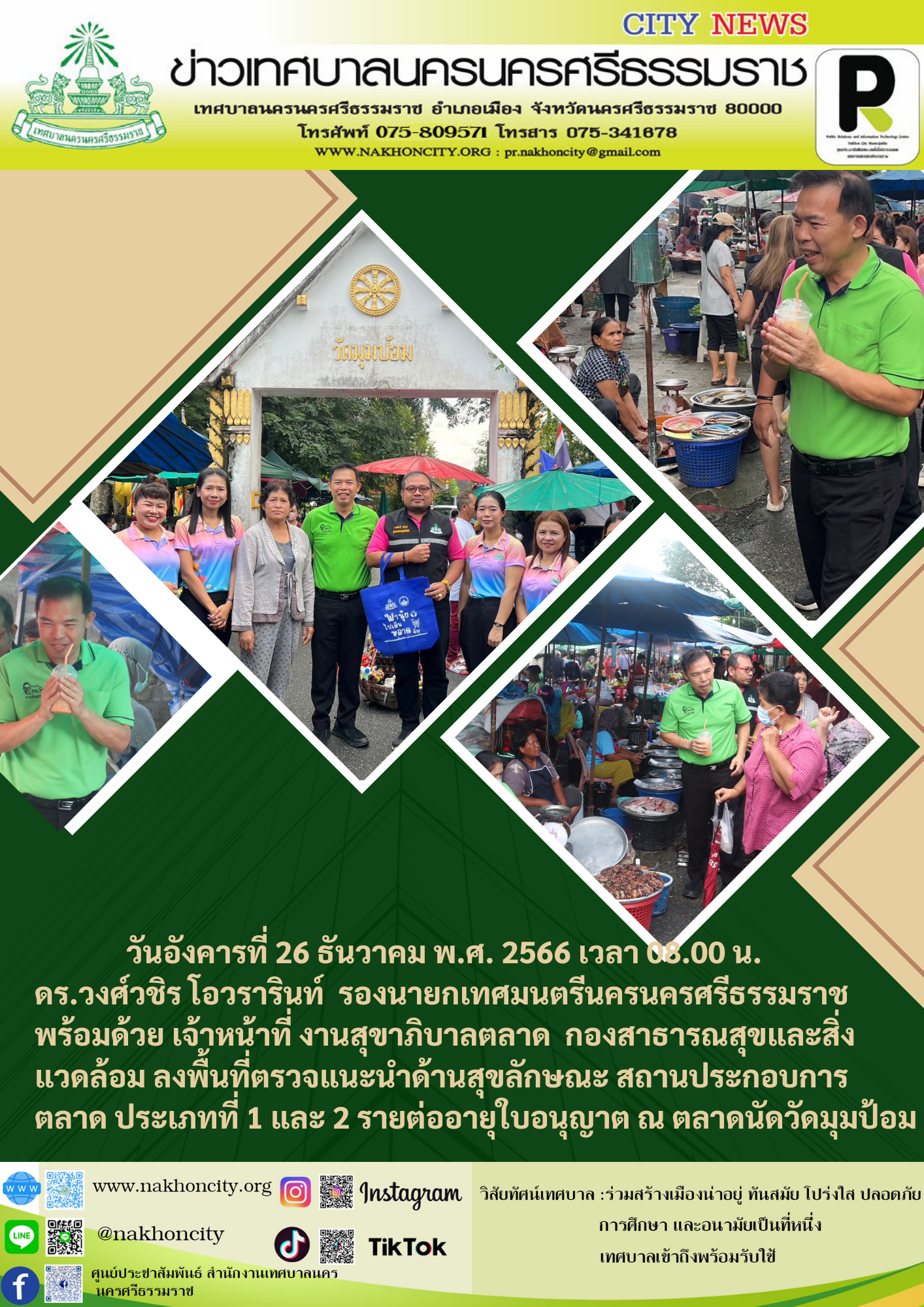 | วันอังคารที่ 26 ธันวาคม พ.ศ. 2566 เวลา 08.00 น. ดร.วงศ์วชิร โอวรารินท์ รองนายกเทศมนตรีนครนครศรีธรรมราช พร้อมด้วย เจ้าหน้าที่ งานสุขาภิบาลตลาด กองสาธารณสุขและสิ่งแวดล้อม ลงพื้นที่ตรวจแนะนำด้านสุขลักษณะ สถานประกอบการตลาด ประเภทที่ 1 และ 2 รายต่ออายุใบอนุญาต ณ ตลาดนัดวัดมุมป้อม |