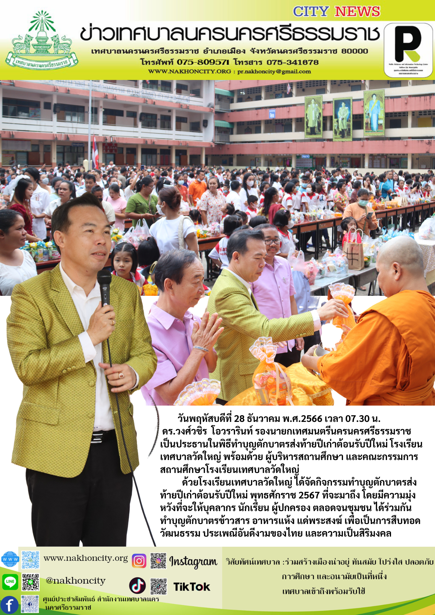 | วันพฤหัสบดีที่ 28 ธันวาคม พ.ศ.2566 เวลา 07.30 น. ดร.วงศ์วชิร โอวรารินท์ รองนายกเทศมนตรีนครนครศรีธรรมราช เป็นประธานในพิธีทำบุญตักบาตรส่งท้ายปีเก่าต้อนรับปีใหม่ โรงเรียนเทศบาลวัดใหญ่ พร้อมด้วย ผู้บริหารสถานศึกษา และคณะกรรมการสถานศึกษาโรงเรียนเทศบาลวัดใหญ่ ด้วยโรงเรียนเทศบาลวัดใหญ่ ได้จัดกิจกรรมทำบุญตักบาตรส่งท้ายปีเก่าต้อนรับปีใหม่ พุทธศักราช 2567 ที่จะมาถึง โดยมีความมุ่งหวังที่จะให้บุคลากร นักเรียน ผู้ปกครอง ตลอดจนชุมชน ได้ร่วมกันทำบุญตักบาตรข้าวสาร อาหารแห้ง แด่พระสงฆ์ เพื่อเป็นการสืบทอดวัฒนธรรม ประเพณีอันดีงามของไทย และความเป็นสิริมงคล |