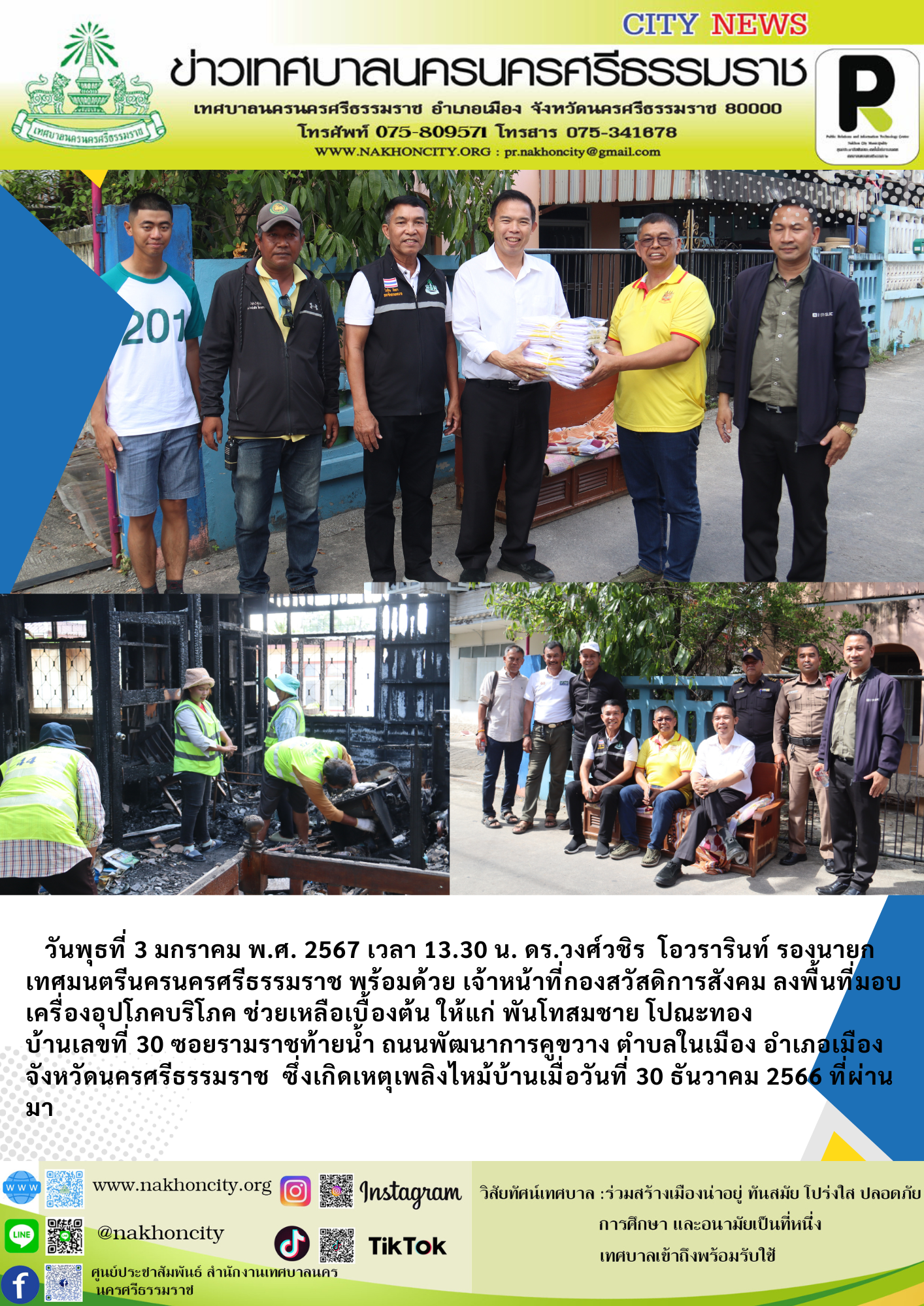 | ดร.วงศ์วชิร โอวรารินท์ รองนายกเทศมนตรีนครนครศรีธรรมราช พร้อมด้วย เจ้าหน้าที่กองสวัสดิการสังคม ลงพื้นที่มอบ เครื่องอุปโภคบริโภค ช่วยเหลือเบื้องต้น ให้แก่ผู้ประสบอัคคีภัย |