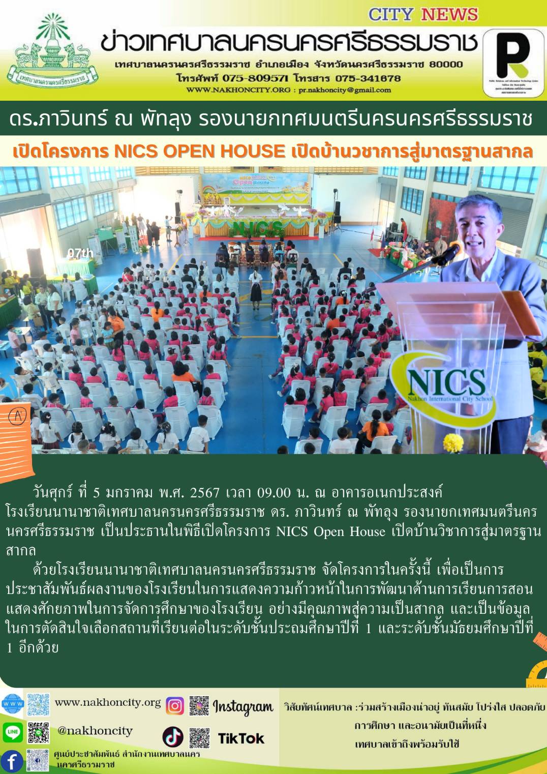 | วันศุกร์ ที่ 5 มกราคม พ.ศ. 2567 เวลา 09.00 น. ณ อาคารอเนกประสงค์ โรงเรียนนานาชาติเทศบาลนครนครศรีธรรมราช ดร. ภาวินทร์ ณ พัทลุง รองนายกเทศมนตรีนครนครศรีธรรมราช เป็นประธานในพิธีเปิดโครงการ NICS Open House เปิดบ้านวิชาการสู่มาตรฐานสากล ด้วยโรงเรียนนานาชาติเทศบาลนครนครศรีธรรมราช จัดโครงการในครั้งนี้ เพื่อเป็นการประชาสัมพันธ์ผลงานของโรงเรียนในการแสดงความก้าวหน้าในการพัฒนาด้านการเรียนการสอน แสดงศักยภาพในการจัดการศึกษาของโรงเรียน อย่างมีคุณภาพสู่ความเป็นสากล และเป็นข้อมูลในการตัดสินใจเลือกสถานที่เรียนต่อในระดับชั้นประถมศึกษาปีที่ 1 และระดับชั้นมัธยมศึกษาปีที่ 1 อีกด้วย .............. ภาพ//ข่าว//จันทร์จิรา ตรวจทาน//ฐิตินันท์ |