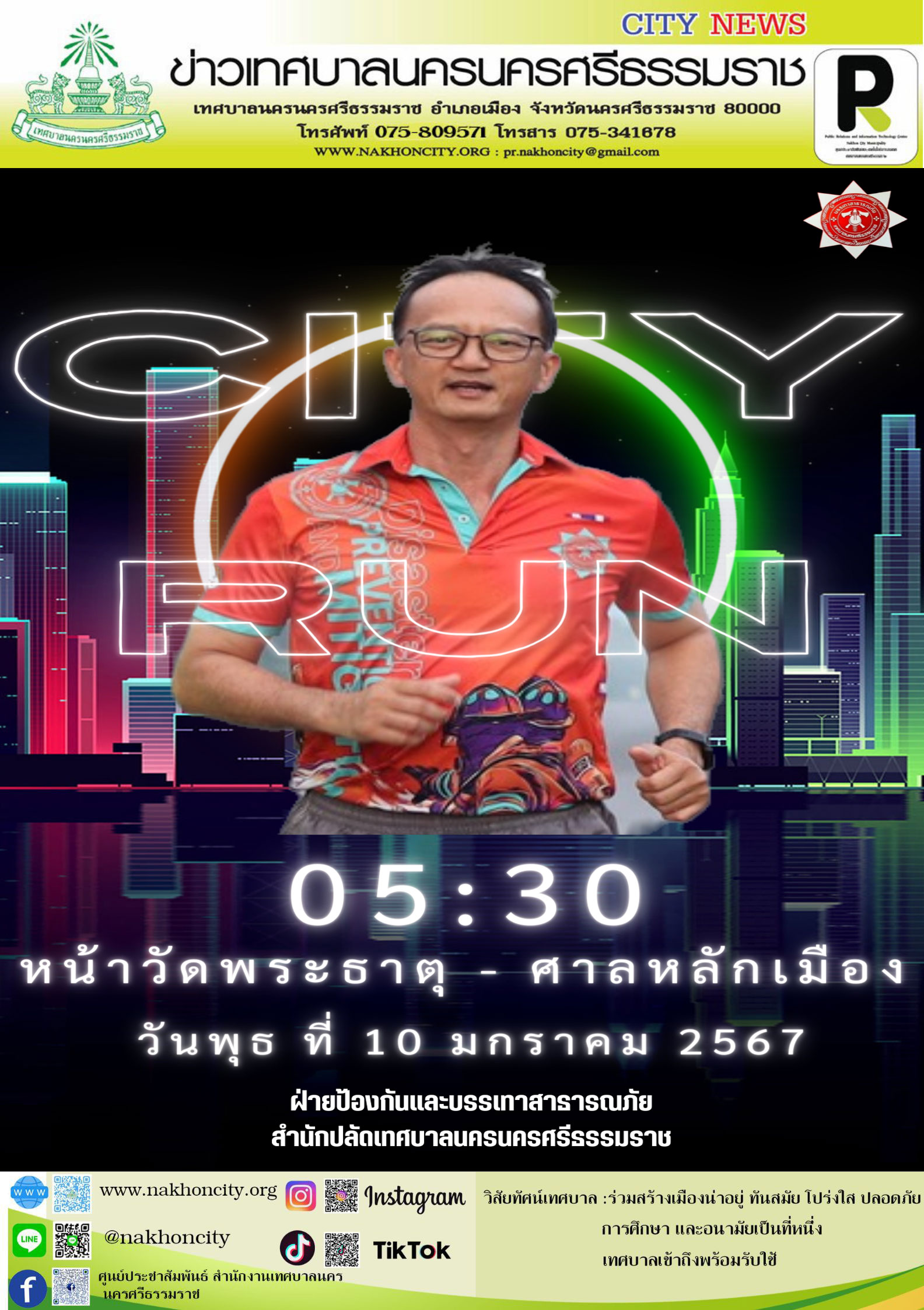 | เทศบาลนครนครศรีธรรมราช ภายใต้การนำ ดร.กณพ เกตุชาติ นายกเทศมนตรีนครนครศรีธรรมราช เชิญชวนประชาชน ร่วมวิ่งออกกำลังกาย ทุกเช้าวันพุธ เวลา 05.30 น.เป็นต้นไป กับกิจกรรม "City Run" พร้อมกับ เจ้าหน้าที่ฝ่ายป้องกันและบรรเทาสาธารณภัย และบุคลากร ของ เทศบาลนครนครศรีธรรมราช ซึ่งใน วันพุธที่ 10 มกราคม 2567 นี้ ขอเชิญชวนผู้ที่จะเข้าร่วมกิจกรรมทุกท่าน พบกันที่หน้าวัดพระมหาธาตุวรมหาวิหาร วิ่งออกถนนศรีธรรมโศก วิ่งผ่านศาลหลักเมือง วิ่งผ่านถนนศรีธรรมราช มาถึงหน้าวัดพระมหาธาตุ กิจกรรมการวิ่งในครั้งนี้ จัดขึ้นเพื่อสำรวจเส้นทาง เตรียมความพร้อม ในด้านการปฏิบัติงาน ให้กับเจ้าหน้าที่ฝ่ายป้องกันและบรรเทาสาธารณภัย และเป็นการส่งเสริมการออกกำลังกาย ให้กับประชาชน
