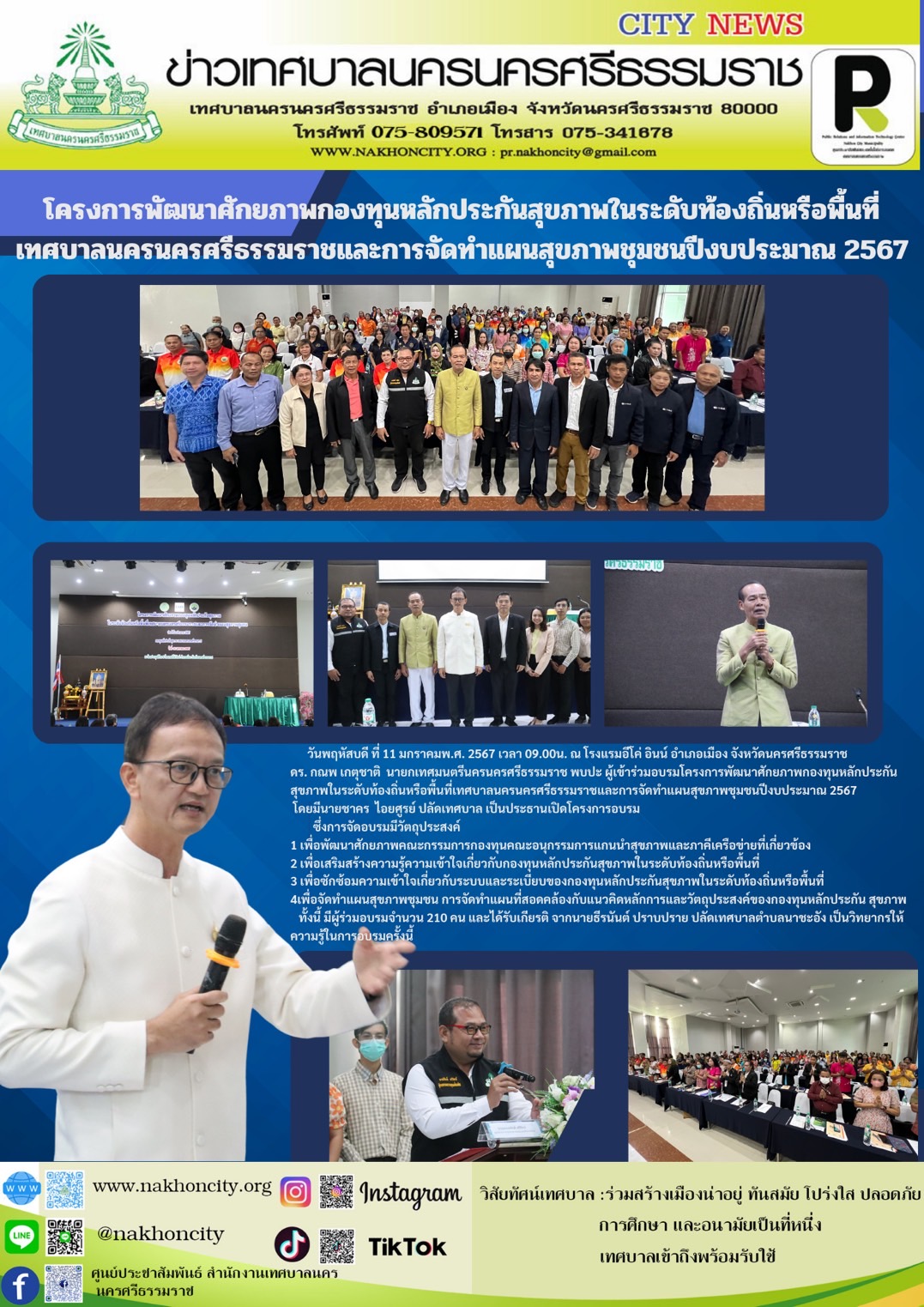 | ดร. กณพ เกตุชาติ นายกเทศมนตรีนครนครศรีธรรมราช พบปะ ผู้เข้าร่วมอบรมโครงการพัฒนาศักยภาพกองทุนหลักประกันสุขภาพในระดับท้องถิ่นหรือพื้นที่เทศบาลนครนครศรีธรรมราชและการจัดทำแผนสุขภาพชุมชนปีงบประมาณ 2567 |