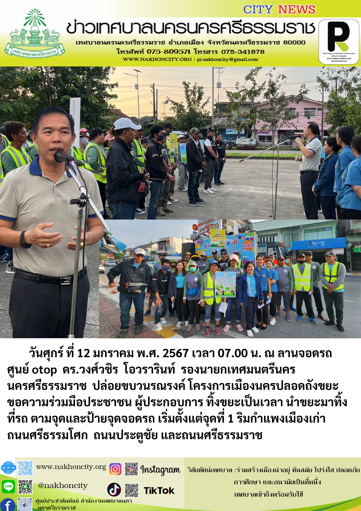 | วันศุกร์ ที่ 12 มกราคม พ.ศ. 2567 เวลา 07.00 น. ณ ลานจอดรถ ศูนย์ otop ดร.วงศ์วชิร โอวรารินท์ รองนายกเทศมนตรีนครนครศรีธรรมราช ปล่อยขบวนรณรงค์ โครงการเมืองนครปลอดถังขยะ ขอความร่วมมือประชาชน ผู้ประกอบการ ทิ้งขยะเป็นเวลา นำขยะมาทิ้งที่รถ ตามจุดและป้ายจุดจอดรถ เริ่มตั้งแต่จุดที่ 1 ริมกำแพงเมืองเก่า ถนนศรีธรรมโศก ถนนประตูชัย และถนนศรีธรรมราช |