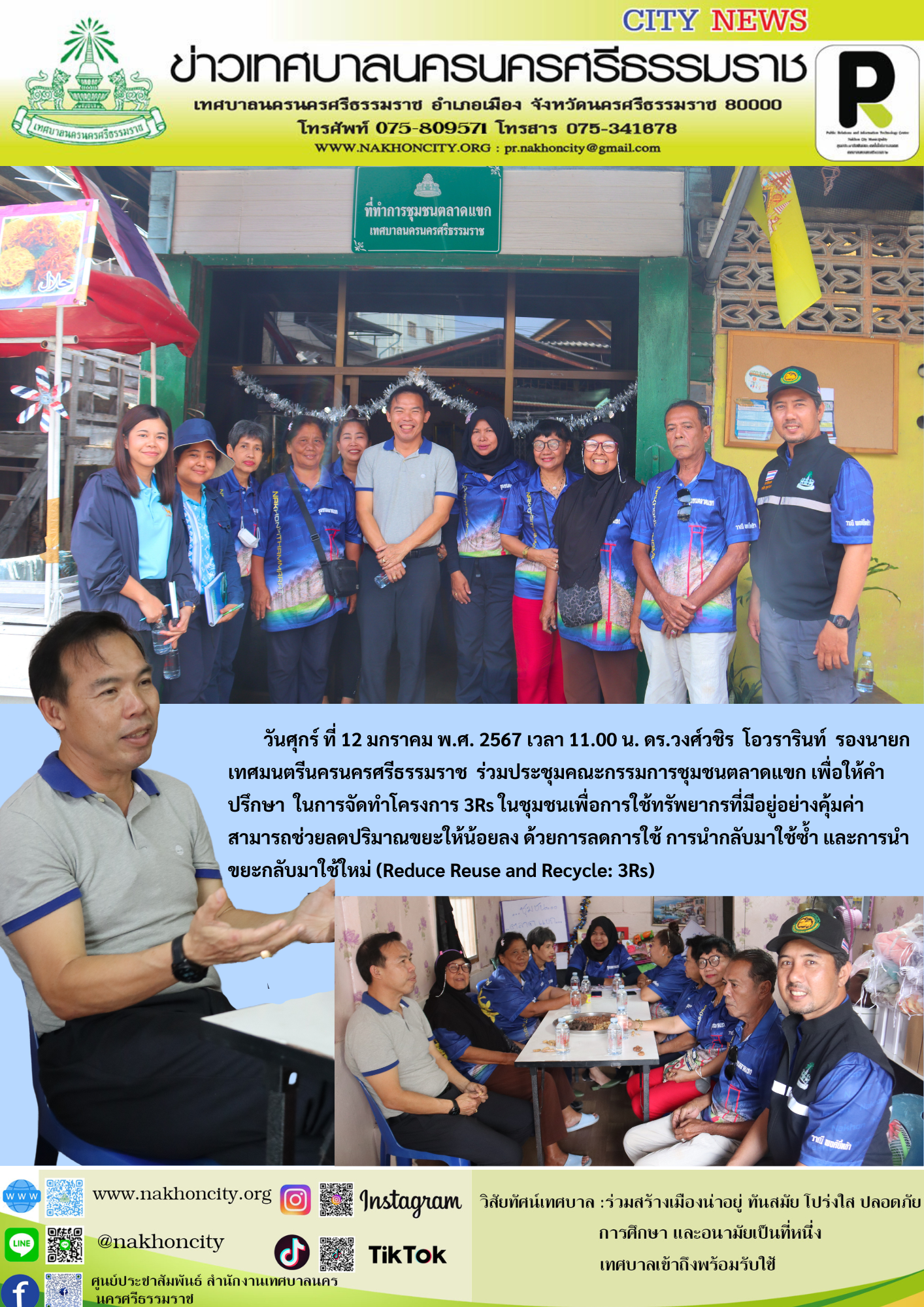 | วันศุกร์ ที่ 12 มกราคม พ.ศ. 2567 เวลา 11.00 น. ดร.วงศ์วชิร โอวรารินท์ รองนายกเทศมนตรีนครนครศรีธรรมราช ร่วมประชุมคณะกรรมการชุมชนตลาดแขก เพื่อให้คำปรึกษา ในการจัดทำโครงการ 3Rs ในชุมชนเพื่อการใช้ทรัพยากรที่มีอยู่อย่างคุ้มค่า สามารถช่วยลดปริมาณขยะให้น้อยลง ด้วยการลดการใช้ การนำกลับมาใช้ซ้ำ และการนำขยะกลับมาใช้ใหม่ (Reduce Reuse and Recycle: 3Rs) |
