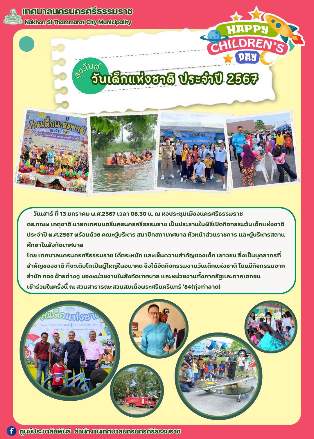 | กิจกรรมงานวันเด็กแห่งชาติ ประจำปี พ.ศ.2567 โดยมีกิจกรรมจาก สำนัก กอง ฝ่ายต่างๆ ของหน่วยงานในสังกัดเทศบาล และหน่วยงานทั้งภาครัฐและถาคเอกชน เข้าร่วม |