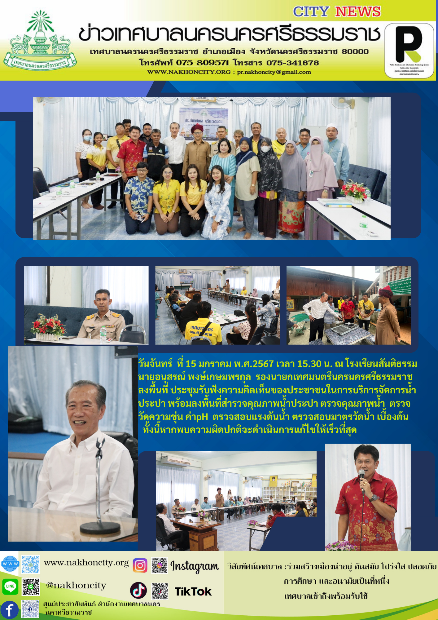| นายอนุสรณ์ พงษ์เกษมพรกุล รองนายกเทศมนตรีนครนครศรีธรรมราช ลงพื้นที่ ประชุมรับฟังความคิดเห็นของประชาชนในการบริการจัดการน้ำประปา พร้อมลงพื้นที่สำรวจคุณภาพน้ำประปา ชุมชนสันติธรรม |