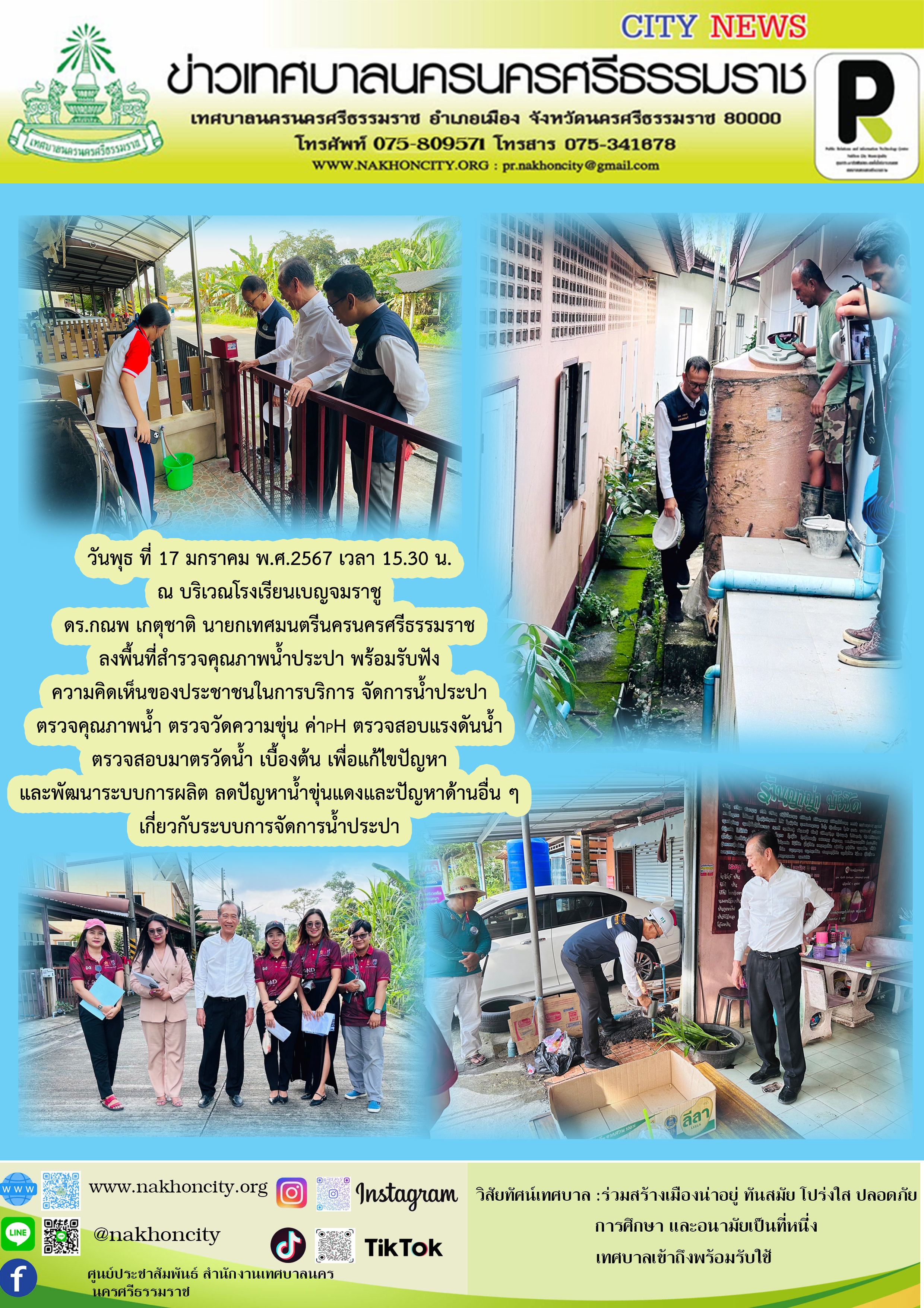 | ดร.กณพ เกตุชาติ นายกเทศมนตรีนครนครศรีธรรมราช ลงพื้นที่ สำรวจคุณภาพน้ำประปาพร้อมรับฟังความคิดเห็นของประชาชนในการบริการจัดการน้ำประปา ตรวจคุณภาพน้ำ ตรวจวัดความขุ่น ค่าpH ตรวจสอบแรงดันน้ำ ตรวจสอบมาตรวัดน้ำ เบื้องต้น |