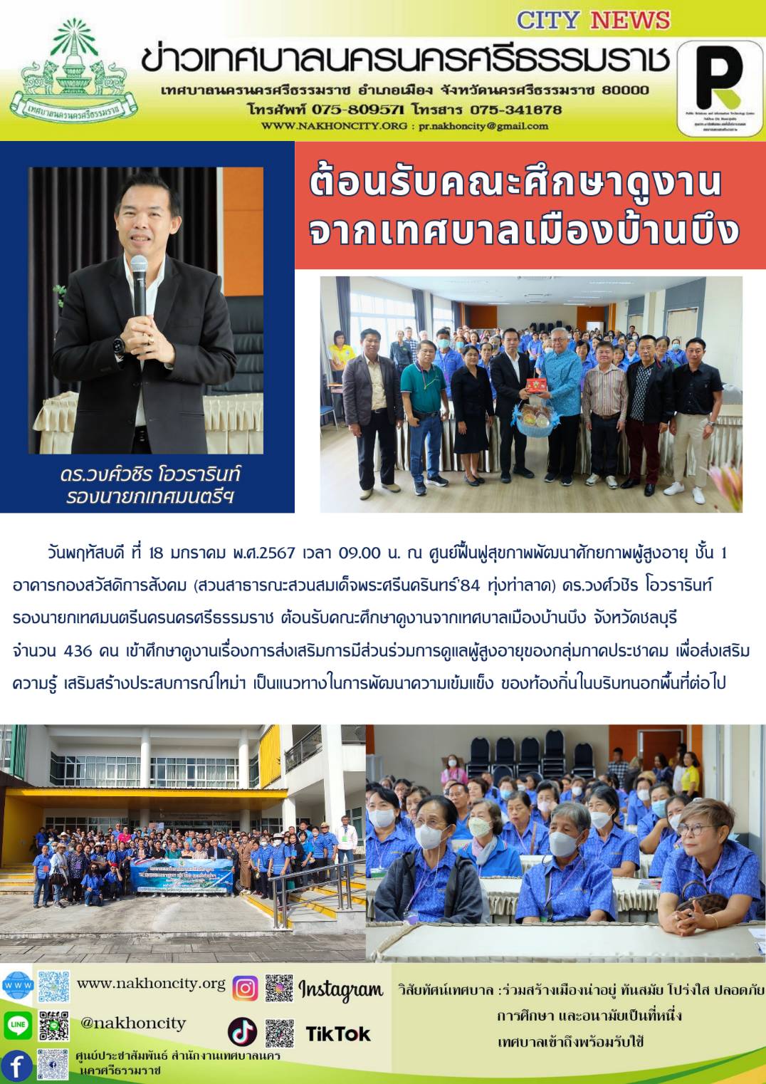 | วันพฤหัสบดี ที่ 18 มกราคม พ.ศ.2567 เวลา 09.00 น. ณ ศูนย์ฟื้นฟูสุขภาพพัฒนาศักยภาพผู้สูงอายุ ชั้น 1 อาคารกองสวัสดิการสังคม (สวนสาธารณะสวนสมเด็จพระศรีนครินทร์’84 ทุ่งท่าลาด) ดร.วงศ์วชิร โอวรารินท์ รองนายกเทศมนตรีนครนครศรีธรรมราช ต้อนรับคณะศึกษาดูงานจากเทศบาลเมืองบ้านบึง จังหวัดชลบุรี จำนวน 436 คน เข้าศึกษาดูงานเรื่อง การส่งเสริมการมีส่วนร่วมการดูแลผู้สูงอายุของกลุ่มภาคประชาคม เพื่อส่งเสริมความรู้ เสริมสร้างประสบการณ์ใหม่ๆ เป็นแนวทางในการพัฒนาความเข้มแข็ง ของท้องถิ่นในบริบทนอกพื้นที่ต่อไป ................ ภาพ//ข่าว//จันทร์จิรา |