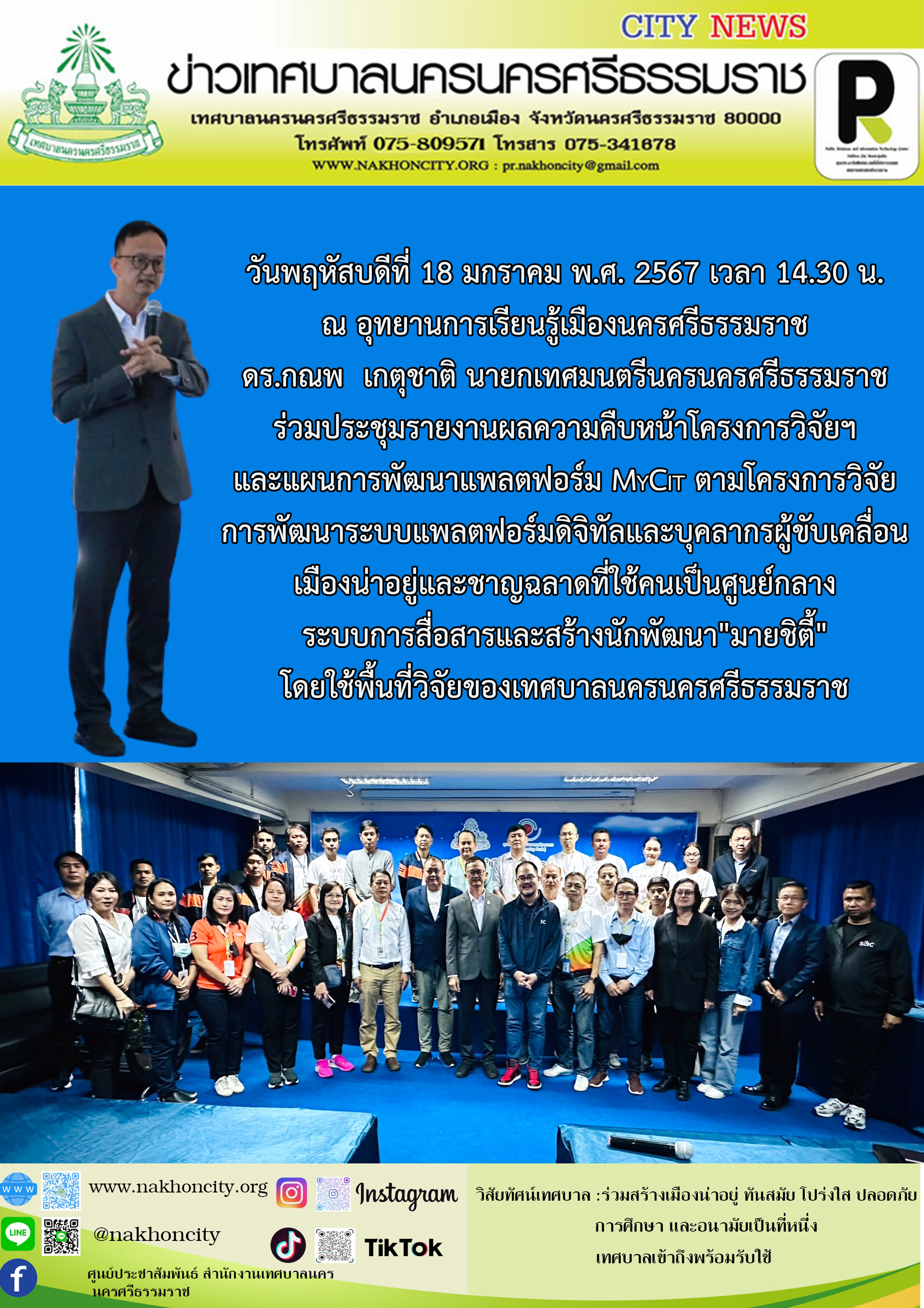 | ดร.กณพ เกตุชาติ นายกเทศมนตรีนครนครศรีธรรมราชร่วมประชุมรายงานผลความคืบหน้าโครงการวิจัยฯ และ แผนการพัฒนาแพลตฟอร์ม My City |
