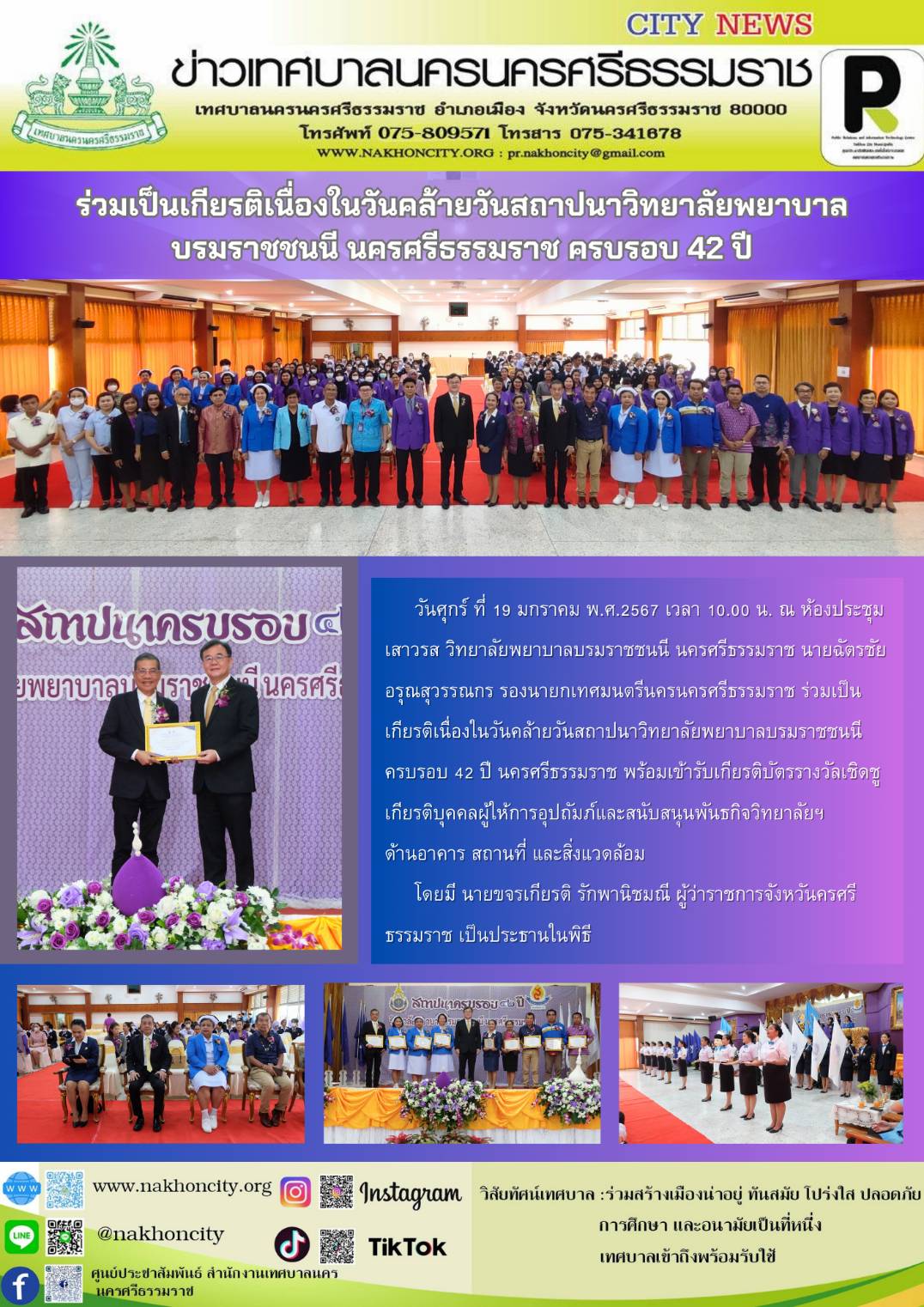 | วันศุกร์ ที่ 19 มกราคม พ.ศ.2567 เวลา 10.00 น. ณ ห้องประชุมเสาวรส วิทยาลัยพยาบาลบรมราชชนนี นครศรีธรรมราช นายฉัตรชัย อรุณสุวรรณกร รองนายกเทศมนตรีนครนครศรีธรรมราช ร่วมเป็นเกียรติเนื่องในวันคล้ายวันสถาปนาวิทยาลัยพยาบาลบรมราชชนนี ครบรอบ 42 ปี นครศรีธรรมราช พร้อมเข้ารับเกียรติบัตรรางวัลเชิดชูเกียรติบุคคลผู้ให้การอุปถัมภ์และสนับสนุนพันธกิจวิทยาลัยฯ ด้านอาคาร สถานที่ และสิ่งแวดล้อม โดยมี นายขจรเกียรติ รักพานิชมณี ผู้ว่าราชการจังหวัดนครศรีธรรมราช เป็นประธานในพิธี ........... ภาพ//ข่าว/จันทร์จิรา ตรวจทาน//ฐิตินันท์