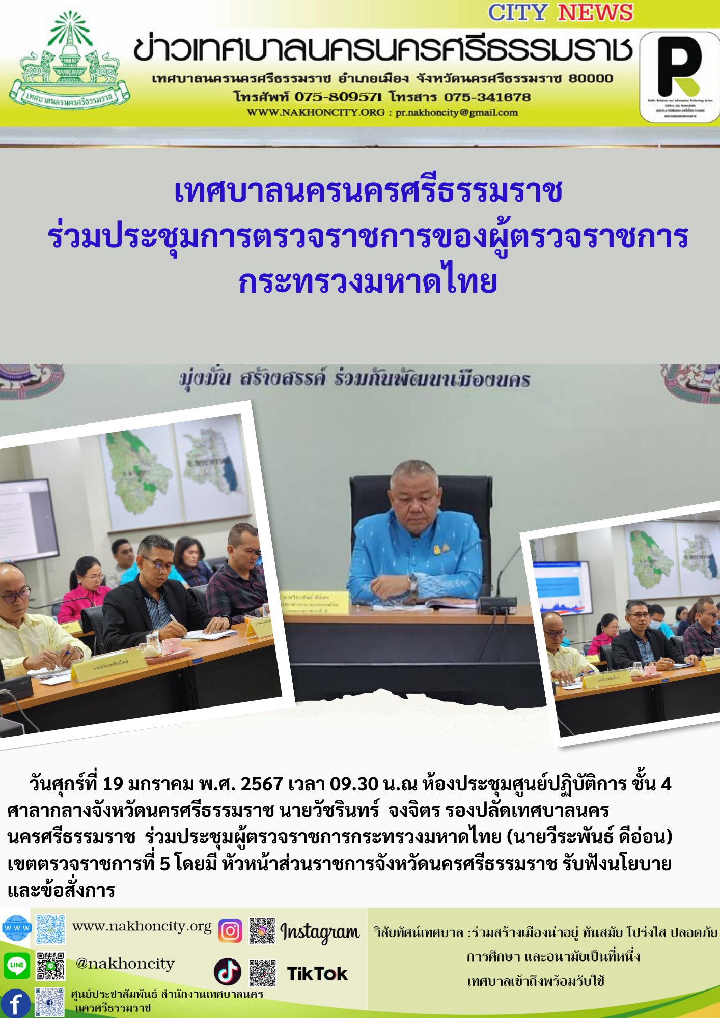 | วันศุกร์ที่ 19 มกราคม พ.ศ. 2567 เวลา 09.30 น.ณ ห้องประชุมศูนย์ปฏิบัติการ ชั้น 4 ศาลากลางจังหวัดนครศรีธรรมราช นายวัชรินทร์ จงจิตร รองปลัดเทศบาลนครนครศรีธรรมราช ร่วมประชุมผู้ตรวจราชการกระทรวงมหาดไทย (นายวีระพันธ์ ดีอ่อน) เขตตรวจราชการที่ 5 โดยมี หัวหน้าส่วนราชการจังหวัดนครศรีธรรมราช รับฟังนโยบายและข้อสั่งการ |