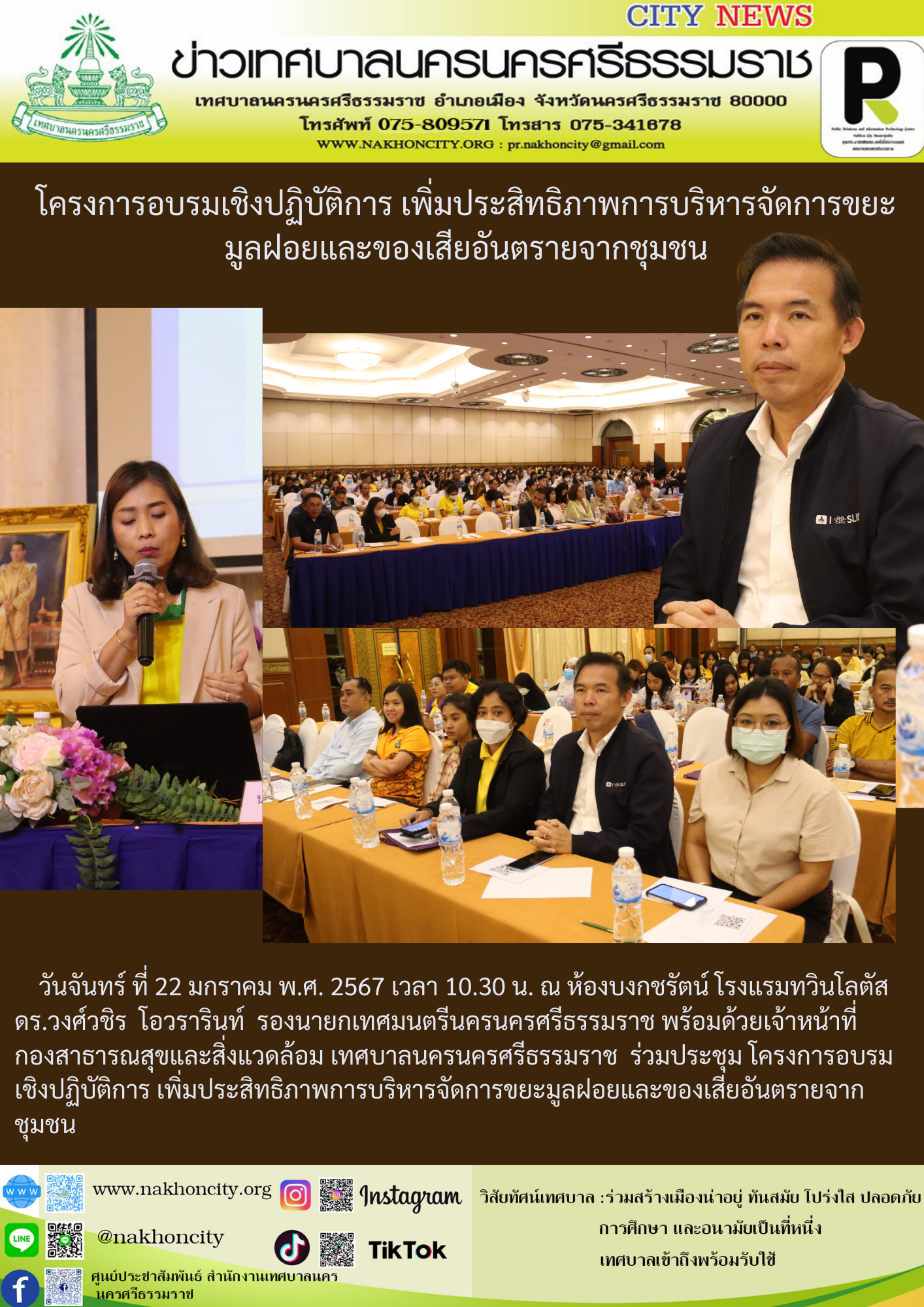| ดร.วงศ์วชิร โอวรารินท์ รองนายกเทศมนตรีนครนครศรีธรรมราช พร้อมด้วยเจ้าหน้าที่ กองสาธารณสุขและสิ่งแวดล้อม เทศบาลนครนครศรีธรรมราช ร่วมประชุม โครงการอบรมเชิงปฏิบัติการ เพิ่มประสิทธิภาพการบริหารจัดการขยะมูลฝอยและของเสียอันตรายจากชุมชน |