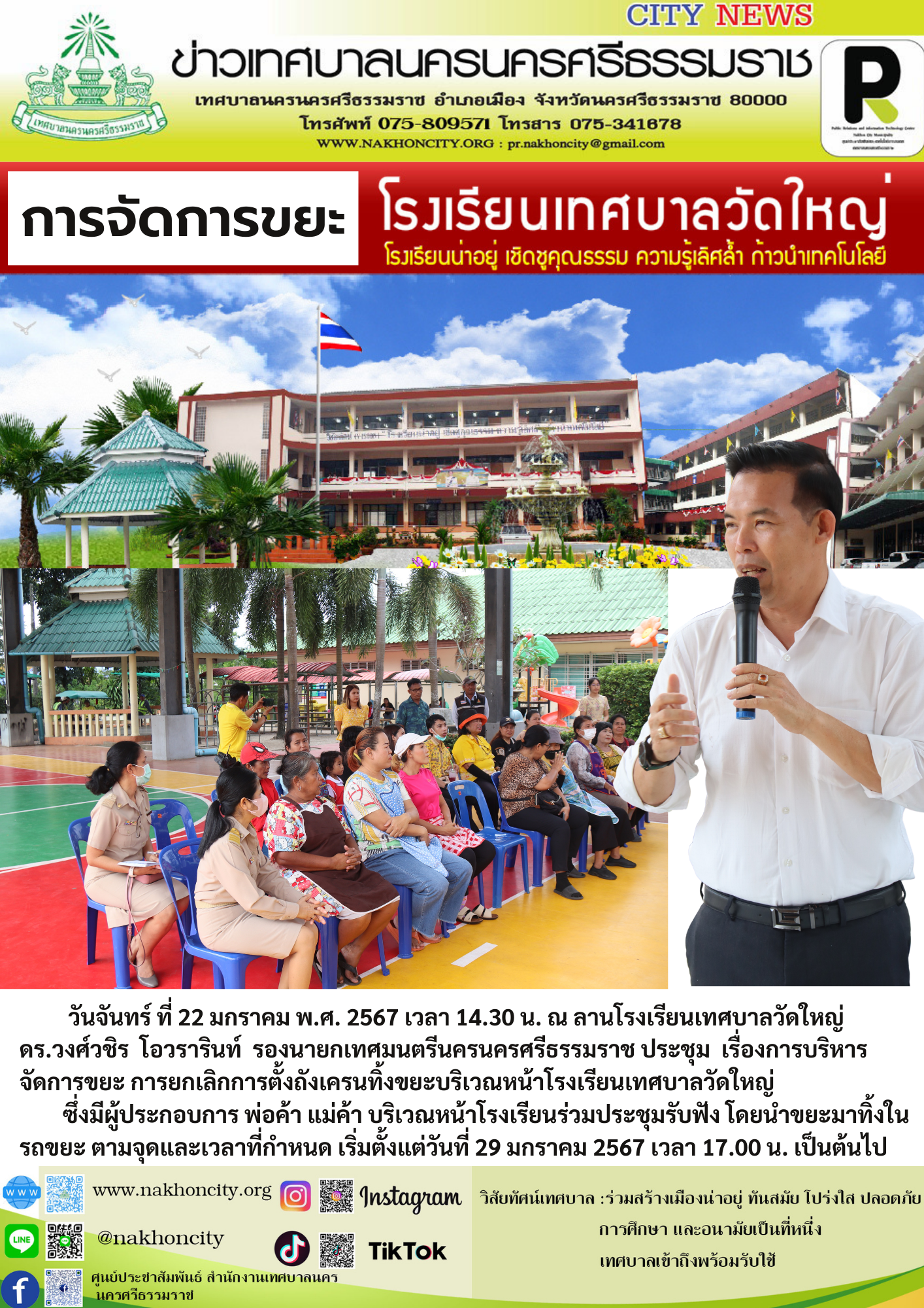 | วันจันทร์ ที่ 22 มกราคม พ.ศ. 2567 เวลา 14.30 น. ณ ลานโรงเรียนเทศบาลวัดใหญ่ ดร.วงศ์วชิร โอวรารินท์ รองนายกเทศมนตรีนครนครศรีธรรมราช ประชุม เรื่องการบริหารจัดการขยะ การยกเลิกการตั้งถังเครนทิ้งขยะบริเวณหน้าโรงเรียนเทศบาลวัดใหญ่ ซึ่งมีผู้ประกอบการ พ่อค้า แม่ค้า บริเวณหน้าโรงเรียนร่วมประชุมรับฟัง โดยนำขยะมาทิ้งในรถขยะ ตามจุดและเวลาที่กำหนด เริ่มตั้งแต่วันที่ 29 มกราคม 2567 เวลา 17.00 น. เป็นต้นไป |