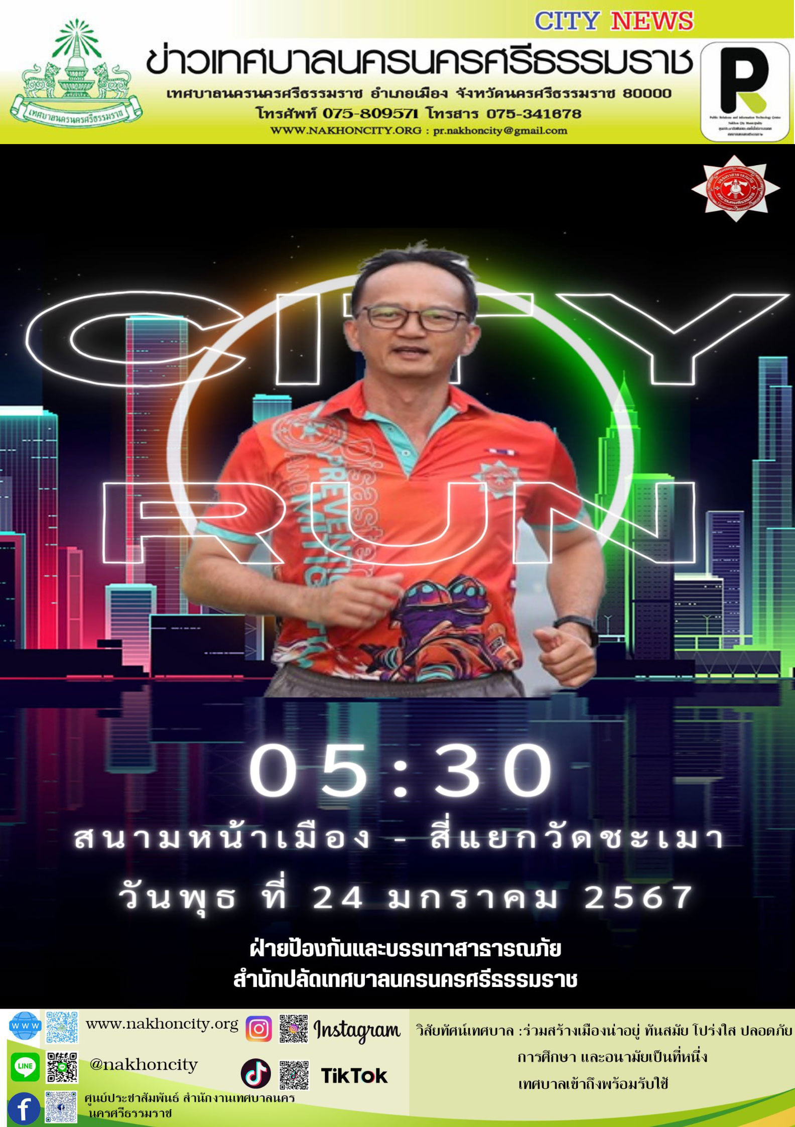 | เทศบาลนครนครศรีธรรมราช ภายใต้การนำ ดร.กณพ เกตุชาติ นายกเทศมนตรีนครนครศรีธรรมราช เชิญชวนประชาชน ร่วมวิ่งออกกำลังกาย ทุกเช้าวันพุธ เวลา 05.30 น.เป็นต้นไป กับกิจกรรม "City Run" พร้อมกับ เจ้าหน้าที่ฝ่ายป้องกันและบรรเทาสาธารณภัย และบุคลากร ของ เทศบาลนครนครศรีธรรมราช ซึ่งใน วันพุธที่ 24 มกราคม 2567 นี้ ขอเชิญชวนผู้ที่จะเข้าร่วมกิจกรรมทุกท่าน พบกันที่สนามหน้าเมือง วิ่งไปจนถึงสี่แยกวัดชะเมา กิจกรรมในครั้งนี้ จัดขึ้นเพื่อสำรวจเส้นทาง เตรียมความพร้อม ในด้านการปฏิบัติงาน ให้กับเจ้าหน้าที่ฝ่ายป้องกันและบรรเทาสาธารณภัย และเป็นการส่งเสริมการออกกำลังกาย ให้กับประชาชน