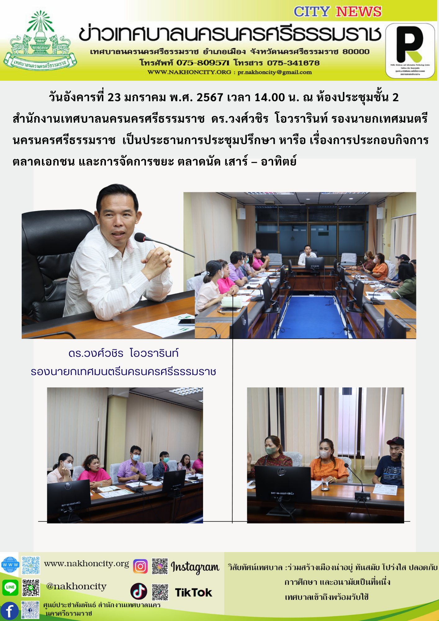 | วันอังคารที่ 23 มกราคม พ.ศ. 2567 เวลา 14.00 น. ณ ห้องประชุมชั้น 2 สำนักงานเทศบาลนครนครศรีธรรมราช ดร.วงศ์วชิร โอวรารินท์ รองนายกเทศมนตรีนครนครศรีธรรมราช เป็นประธานการประชุมปรึกษา หารือ เรื่องการประกอบกิจการตลาดเอกชน และการจัดการขยะ ตลาดนัด เสาร์ – อาทิตย์