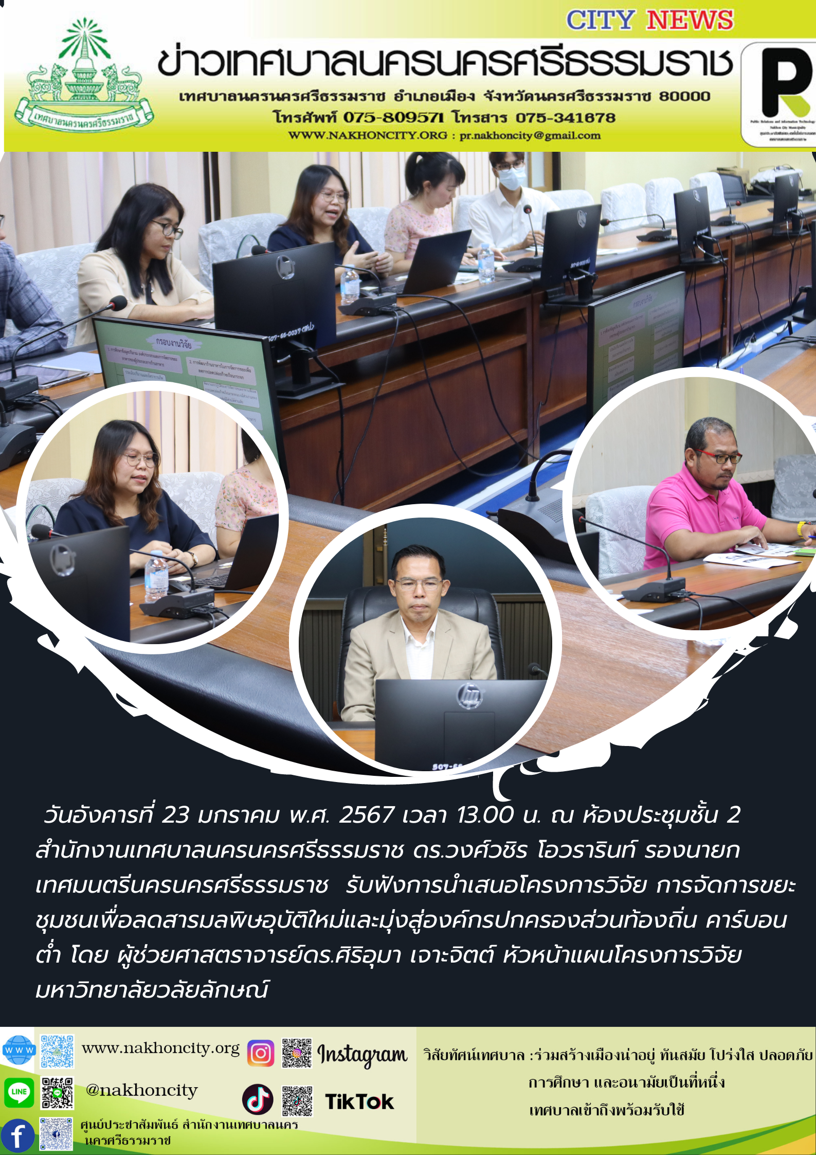 วันอังคารที่ 23 มกราคม พ.ศ. 2567 เวลา 13.00 น. ณ ห้องประชุมชั้น 2 สำนักงานเทศบาลนครนครศรีธรรมราช ดร.วงศ์วชิร โอวรารินท์ รองนายกเทศมนตรีนครนครศรีธรรมราช รับฟังการนำเสนอโครงการวิจัย การจัดการขยะชุมชนเพื่อลดสารมลพิษอุบัติใหม่และมุ่งสู่องค์กรปกครองส่วนท้องถิ่นคาร์บอนต่ำ โดย ผู้ช่วยศาสตราจารย์ ดร.ศิริอุมา เจาะจิตต์ หัวหน้าแผนโครงการวิจัย มหาวิทยาลัยวลัยลักษณ์