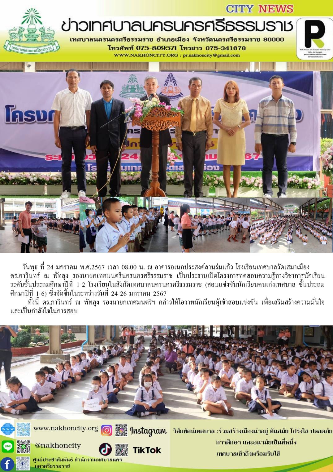 | ดร.ภาวินทร์ ณ พัทลุง รองนายกเทศมนตรีนครนครศรีธรรมราช เป็นประธานเปิดโครงการทดสอบความรู้ทางวิชาการนักเรียนระดับชั้นประถมศึกษาปีที่ 1-2 โรงเรียนในสังกัดเทศบาลนครนครศรีธรรมราช |
