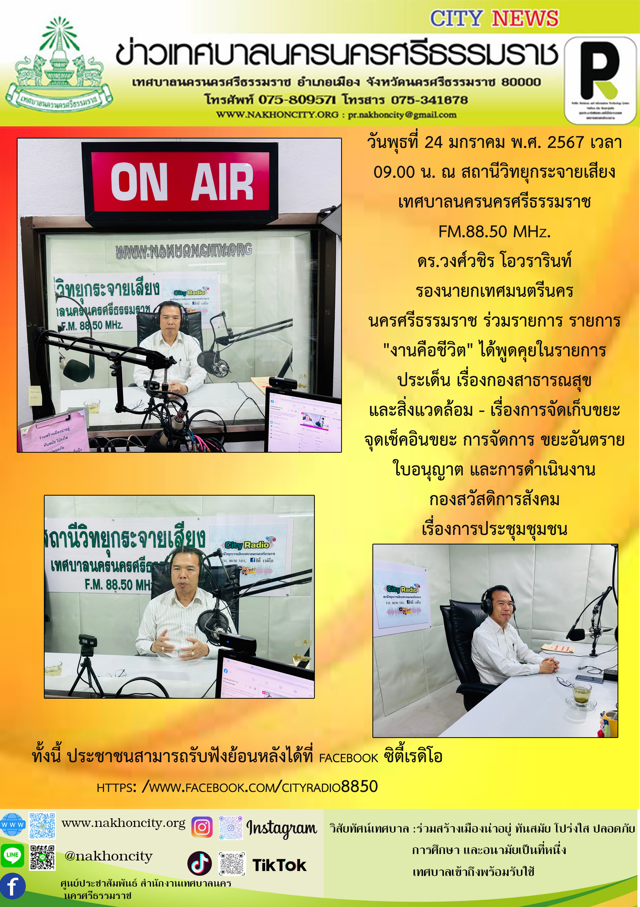 | วันพุธที่ 24 มกราคม พ.ศ. 2567 เวลา 09.00 น. ณ สถานีวิทยุกระจายเสียง เทศบาลนครนครศรีธรรมราช FM.88.50 MHz. ดร.วงศ์วชิร โอวรารินท์ รองนายกเทศมนตรีนครนครศรีธรรมราช ร่วมรายการ รายการ "งานคือชีวิต" ได้พูดคุยในรายการประเด็น เรื่องกองสาธารณสุขและสิ่งแวดล้อม - เรื่องการจัดเก็บขยะ จุดเช็คอินขยะ การจัดการ ขยะอันตราย ใบอนุญาต และการดำเนินงานกองสวัสดิการสังคม เรื่องการประชุมชุมชน ทั้งนี้ ประชาชนสามารถรับฟังย้อนหลังได้ที่ facebook ซิตี้เรดิโอ https: /www.facebook.com/cityradio8850 ภาพ//ข่าว//ไกรสืทธิ เว็บพนันอันดับ1 HUC99 เว็บตรง ไม่ผ่านเอเย่นต์ |