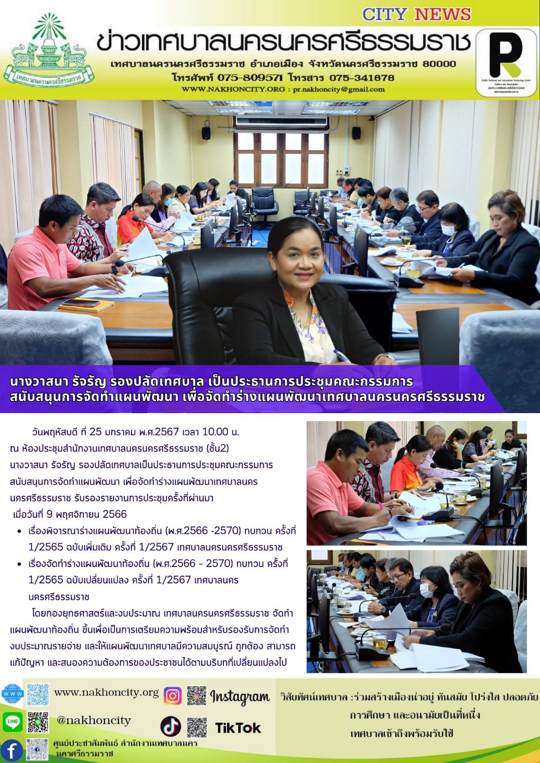 | วันพฤหัสบดี ที่ 25 มกราคม พ.ศ.2567 เวลา 10.00 น. ณ ห้องประชุมสำนักงานเทศบาลนครนครศรีธรรมราช (ชั้น2) นางวาสนา รัจรัญ รองปลัดเทศบาล เป็นประธานการประชุมคณะกรรมการสนับสนุนการจัดทำแผนพัฒนา เพื่อจัดทำร่างแผนพัฒนาเทศบาลนครนครศรีธรรมราช รับรองรายงานการประชุมครั้งที่ผ่านมา เมื่อวันที่ 9 พฤศจิกายน 2566