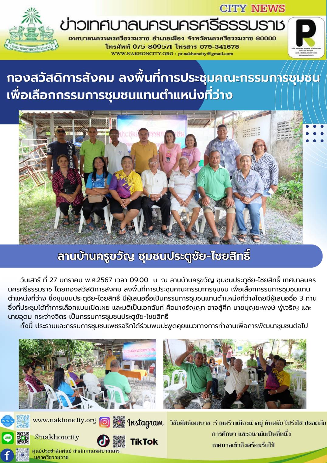 | เทศบาลนครนครศรีธรรมราช โดยกองสวัสดิการสังคม ลงพื้นที่การประชุมคณะกรรมการชุมชน เพื่อเลือกกรรมการชุมชนแทนตำแหน่งที่ว่าง ชุมชนประตูชัย-ไชยสิทธิ์ |