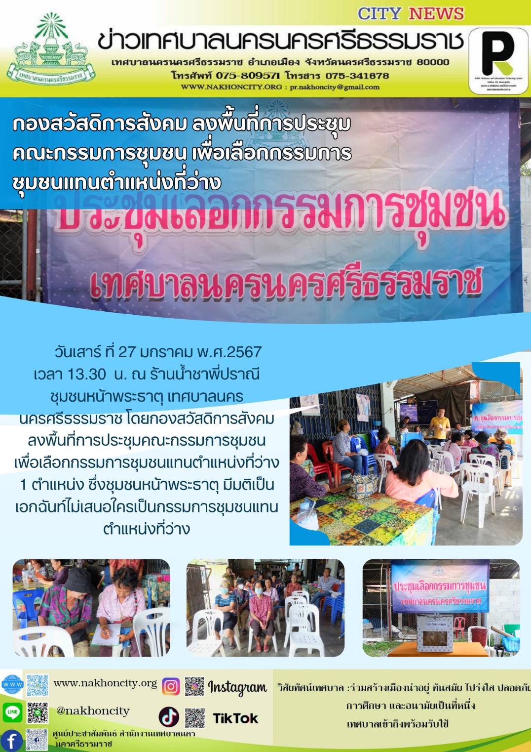 | วันเสาร์ ที่ 27 มกราคม พ.ศ.2567 เวลา 13.30 น. ณ ร้านน้ำชาพี่ปราณี ชุมชนหน้าพระธาตุ เทศบาลนครนครศรีธรรมราช โดยกองสวัสดิการสังคม ลงพื้นที่การประชุมคณะกรรมการชุมชน เพื่อเลือกกรรมการชุมชนแทนตำแหน่งที่ว่าง 1 ตำแหน่ง ซึ่งชุมชนหน้าพระธาตุ มีมติเป็นเอกฉันท์ไม่เสนอใครเป็นกรรมการชุมชนแทนตำแหน่งที่ว่าง ……… ภาพ//ข่าว//จันทร์จิรา