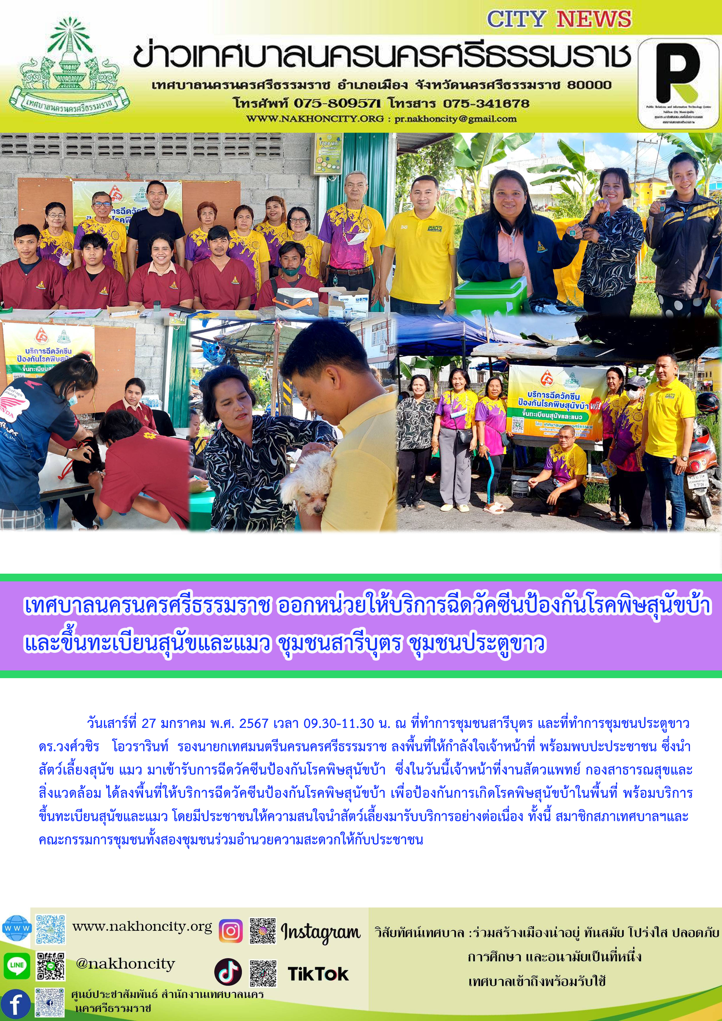 | เทศบาลนครนครศรีธรรมราช ออกหน่วยให้บริการฉีดวัคซีนป้องกันโรคพิษสุนัขบ้า พร้อมบริการขึ้นทะเบียนสุนัขและแมว ชุมชนสารีบุตร ชุมชนประตูขาว |