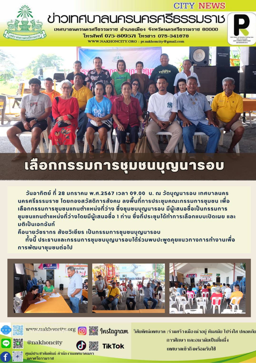 | เทศบาลนครนครศรีธรรมราช โดยกองสวัสดิการสังคม ลงพื้นที่การประชุมคณะกรรมการชุมชน เพื่อเลือกกรรมการชุมชนแทนตำแหน่งที่ว่าง ชุมชนบุญนารอบ |