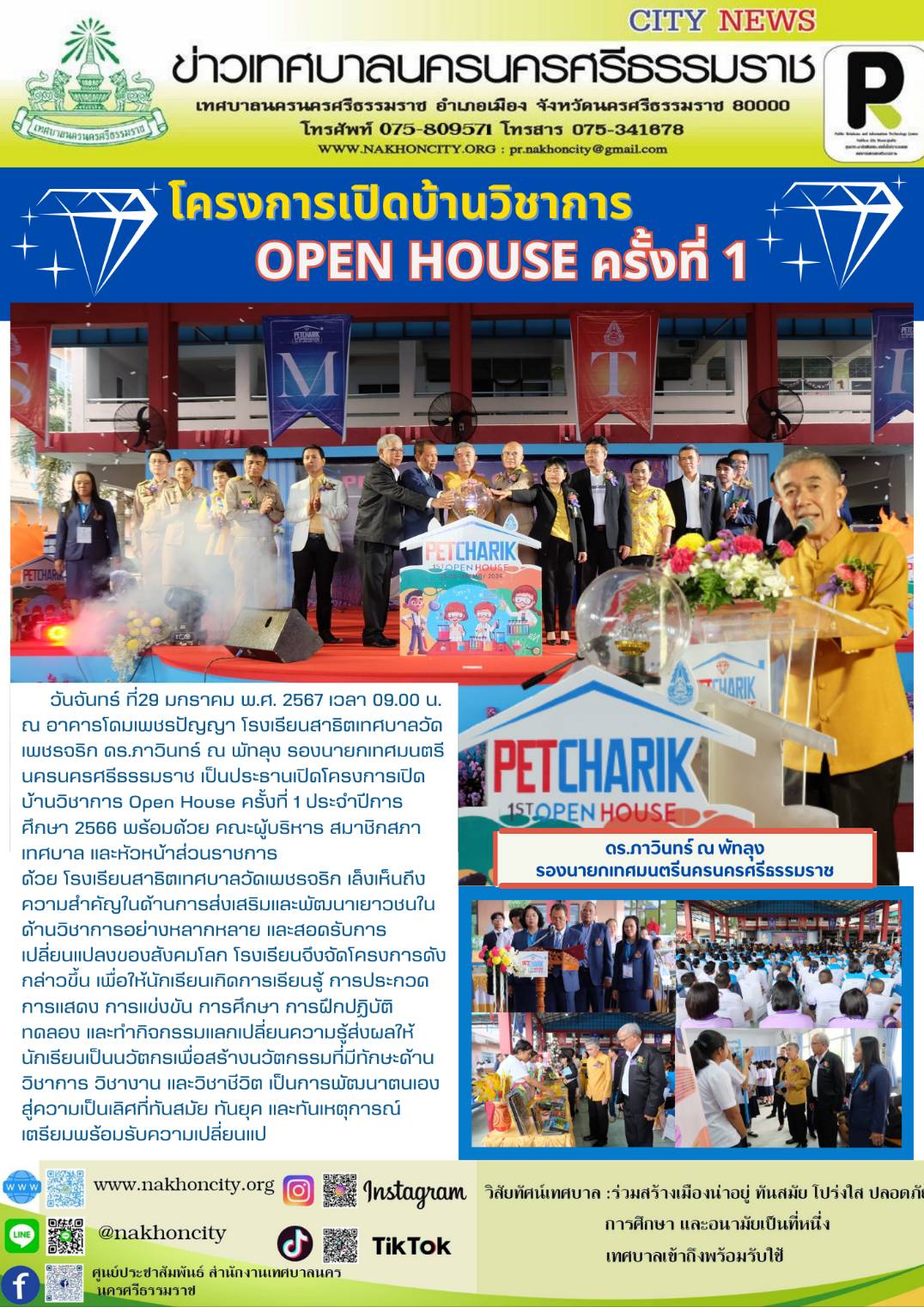 | ดร.ภาวินทร์ ณ พัทลุง รองนายกเทศมนตรีนครนครศรีธรรมราช เป็นประธานเปิดโครงการเปิดบ้านวิชาการ Open House ครั้งที่ 1 ประจำปีการศึกษา 2566 |