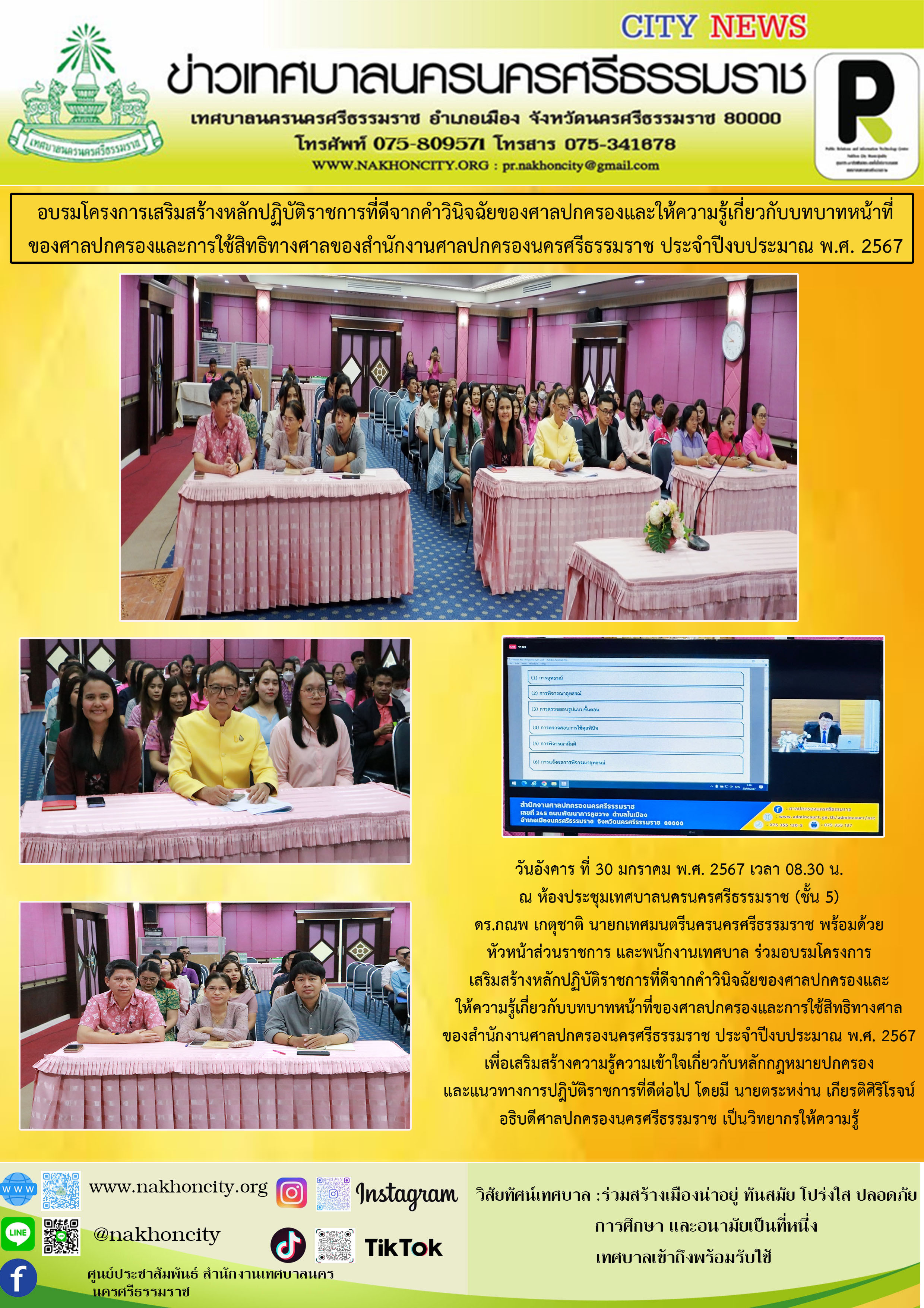| ดร.กณพ เกตุชาติ นายกเทศมนตรีนครนครศรีธรรมราช พร้อมด้วย หัวหน้าส่วนราชการ และพนักงานเทศบาล ร่วมอบรมโครงการเสริมสร้างหลักปฏิบัติราชการที่ดีจากคำวินิจฉัยของศาลปกครองและให้ความรู้เกี่ยวกับบทบาทหน้าที่ของศาลปกครองและการใช้สิทธิทางศาลของสำนักงานศาลปกครองนครศรีธรรมราช ประจำปีงบประมาณ พ.ศ. 2567 |