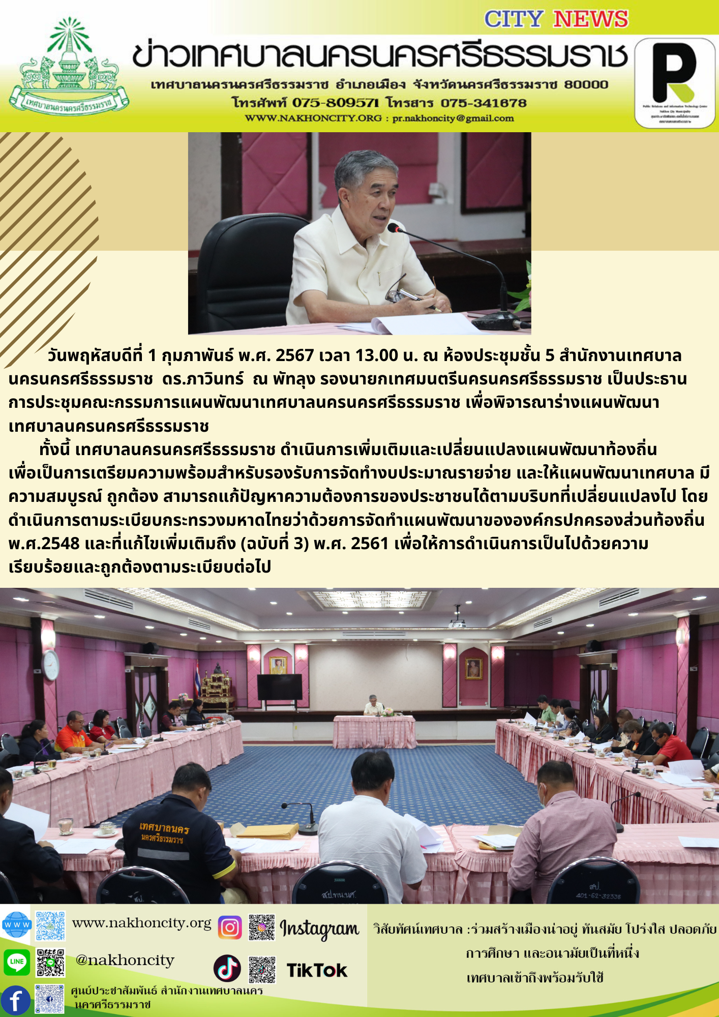| วันพฤหัสบดีที่ 1 กุมภาพันธ์ พ.ศ. 2567 เวลา 13.00 น. ณ ห้องประชุมชั้น 5 สำนักงานเทศบาลนครนครศรีธรรมราช ดร.ภาวินทร์ ณ พัทลุง รองนายกเทศมนตรีนครนครศรีธรรมราช เป็นประธานการประชุมคณะกรรมการแผนพัฒนาเทศบาลนครนครศรีธรรมราช เพื่อพิจารณาร่างแผนพัฒนาเทศบาลนครนครศรีธรรมราช ทั้งนี้ เทศบาลนครนครศรีธรรมราช ดำเนินการเพิ่มเติมและเปลี่ยนแปลงแผนพัฒนาท้องถิ่น เพื่อเป็นการเตรียมความพร้อมสำหรับรองรับการจัดทำงบประมาณรายจ่าย และให้แผนพัฒนาเทศบาล มีความสมบูรณ์ ถูกต้อง สามารถแก้ปัญหาความต้องการของประชาชนได้ตามบริบทที่เปลี่ยนแปลงไป โดยดำเนินการตามระเบียบกระทรวงมหาดไทยว่าด้วยการจัดทำแผนพัฒนาขององค์กรปกครองส่วนท้องถิ่น พ.ศ.2548 และที่แก้ไขเพิ่มเติมถึง (ฉบับที่ 3) พ.ศ. 2561 เพื่อให้การดำเนินการเป็นไปด้วยความเรียบร้อยและถูกต้องตามระเบียบต่อไป