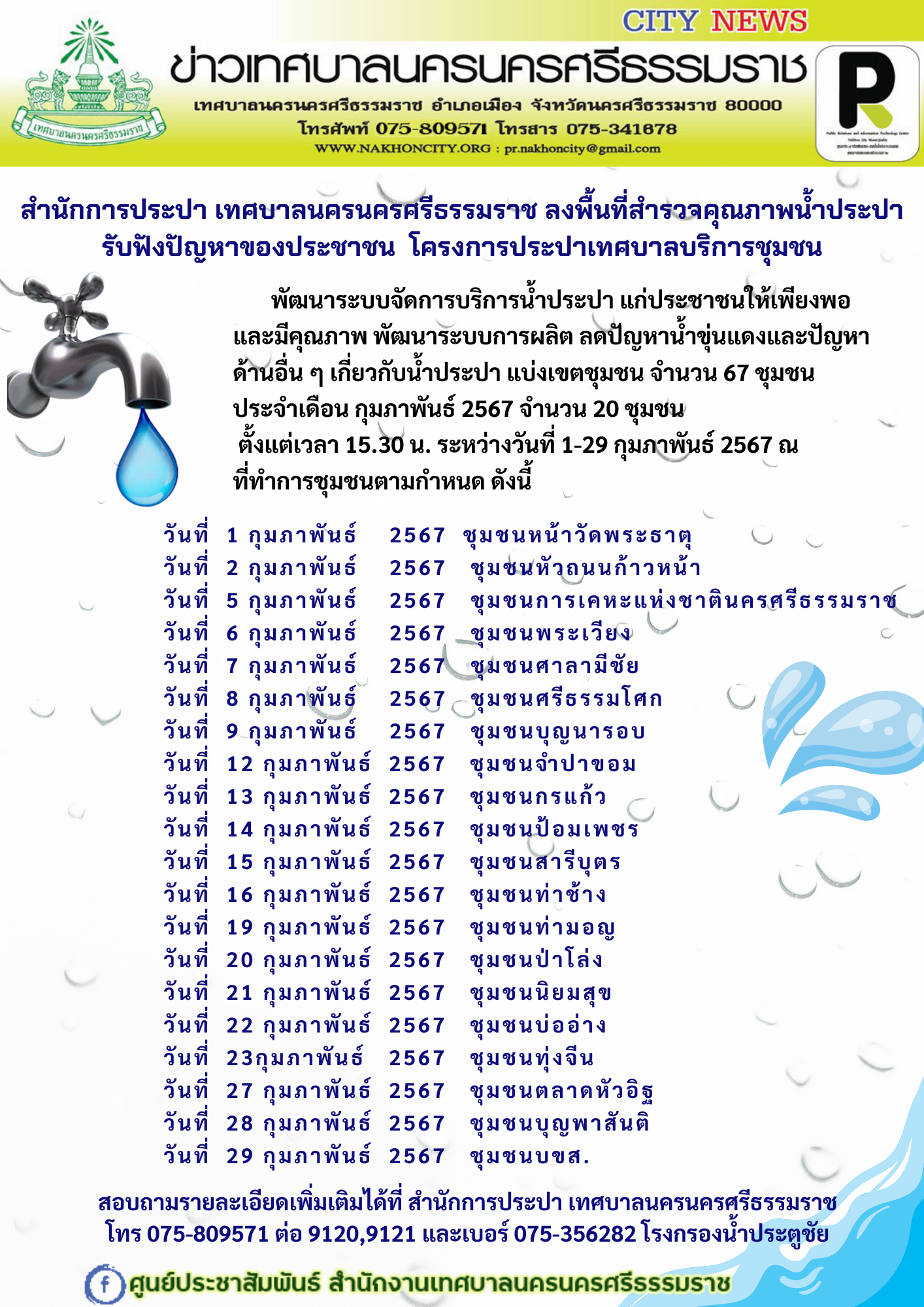 | เทศบาลนครนครศรีธรรมราช ภายใต้การนำของ ดร.กณพ เกตุชาติ นายกเทศมนตรีนครนครศรีธรรมราช โดยสำนักการประปา เทศบาลนครนครศรีธรรมราช จัดทำโครงการประปาเทศบาลบริการชุมชน ประจำปีงบประมาณ 2567 สำนักการประปา เทศบาลนครนครศรีธรรมราช พัฒนาระบบจัดการบริการน้ำประปาแก่ประชาชนให้เพียงพอและมีคุณภาพ พัฒนาระบบการผลิต ลดปัญหาน้ำขุ่นแดงและปัญหาด้านอื่น ๆ เกี่ยวกับน้ำประปา ลงพื้นที่สำรวจคุณภาพน้ำประปา รับฟังปัญหาต่าง ๆ เกี่ยวกับระบบประปา แบ่งเขตชุมชน จำนวน 67 ชุมชนเดือนกุมภาพันธ์ 2567 จำนวน 20 ชุมชน ตั้งแต่เวลา 15.30 น. ระหว่างวันที่ 1-29 กุมภาพันธ์ 2567 ณ ที่ทำการชุมชนตามกำหนด ดังนี้ วันที่ 1 กุมภาพันธ์ 2567 ชุมชนหน้าวัดพระธาตุ วันที่ 2 กุมภาพันธ์ 2567 ชุมชนหัวถนนก้าวหน้า วันที่ 5 กุมภาพันธ์ 2567 ชุมชนการเคหะแห่งชาตินครศรีธรรมราช วันที่ 6 กุมภาพันธ์ 2567 ชุมชนพระเวียง วันที่ 7 กุมภาพันธ์ 2567 ชุมชนศาลามีชัย วันที่ 8 กุมภาพันธ์ 2567 ชุมชนศรีธรรมโศก วันที่ 9 กุมภาพันธ์ 2567 ชุมชนบุญนารอบ วันที่ 12 กุมภาพันธ์ 2567 ชุมชนจำปาขอม วันที่ 13 กุมภาพันธ์ 2567 ชุมชนกรแก้ว วันที่ 14 กุมภาพันธ์ 2567 ชุมชนป้อมเพชร วันที่ 15 กุมภาพันธ์ 2567 ชุมชนสารีบุตร วันที่ 16 กุมภาพันธ์ 2567 ชุมชนท่าช้าง วันที่ 19 กุมภาพันธ์ 2567 ชุมชนท่ามอญ วันที่ 20 กุมภาพันธ์ 2567 ชุมชนป่าโล่ง วันที่ 21 กุมภาพันธ์ 2567 ชุมชนนิยมสุข วันที่ 22 กุมภาพันธ์ 2567 ชุมชนบ่ออ่าง วันที่ 23กุมภาพันธ์ 2567 ชุมชนทุ่งจีน วันที่ 27 กุมภาพันธ์ 2567 ชุมชนตลาดหัวอิฐ วันที่ 28 กุมภาพันธ์ 2567 ชุมชนบุญพาสันติ วันที่ 29 กุมภาพันธ์ 2567 ชุมชนบขส. สอบถามรายละเอียดเพิ่มเติมได้ที่ สำนักการประปา เทศบาลนครนครศรีธรรมราช โทร 075-809571 ต่อ 9120,9121 และเบอร์ 075-356282 โรงกรองน้ำประตูชัย