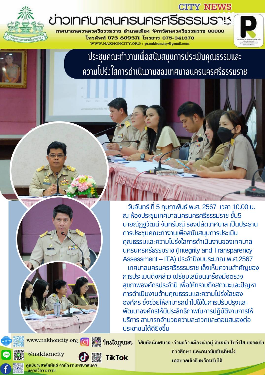 | วันจันทร์ ที่ 5 กุมภาพันธ์ 2567 เวลา 10.00 น. ณ ห้องประชุมเทศบาลนครนครศรีธรรมราช ชั้น5 นายณัฏฐวัฒน์ จันทร์มณี รองปลัดเทศบาล เป็นประธานการประชุมคณะทำงานเพื่อสนับสนุนการประเมินคุณธรรมและความโปร่งใสการดำเนินงานของเทศบาลนครนครศรีธรรมราช (Integrity and Transparency Assessment – ITA) ประจำปีงบประมาณ พ.ศ.2567 เทศบาลนครนครศรีธรรมราช เล็งเห็นความสำคัญของการประเมินดังกล่าว เปรียบเสมือนเครื่องมือตรวจสุขภาพองค์กรประจำปี เพื่อให้ทราบถึงสถานะและปัญหาการดำเนินงานด้านคุณธรรมและความโปร่งใสขององค์กร ซึ่งช่วยให้สามารถนำไปใช้ในการปรับปรุงและพัฒนาองค์กรให้มีประสิทธิภาพในการปฏิบัติงานการให้บริการ สามารถอำนวยความสะดวกและตอบสนองต่อประชาชนได้ดียิ่งขึ้น ………………… ภาพ // ข่าว //จันทร์จิรา ตรวจทาน//ฐิตินันท์ |