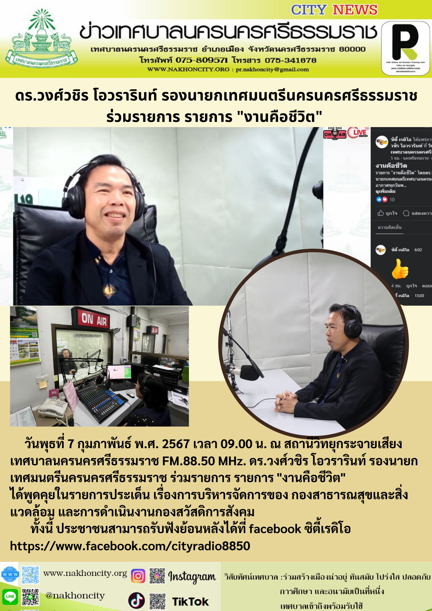 | ดร.วงศ์วชิร โอวรารินท์ รองนายกเทศมนตรีนครนครศรีธรรมราช ร่วมรายการ รายการ "งานคือชีวิต" ทางสถานีวิทยุกระจายเสียง เทศบาลนครนครศรีธรรมราช FM.88.50 MHz. |