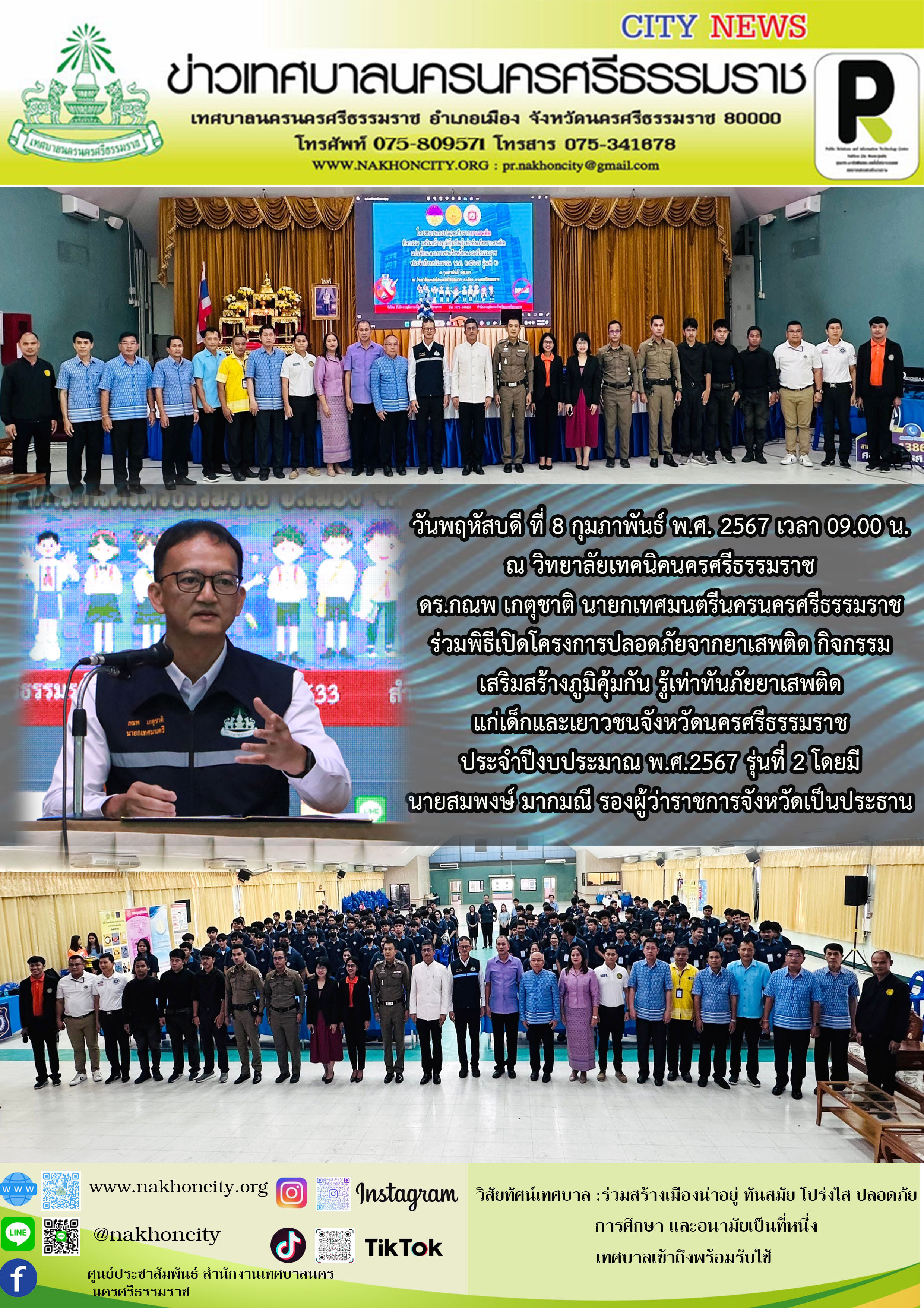 | ดร.กณพ เกตุชาติ นายกเทศมนตรีนครนครศรีธรรมราช ร่วมพิธีเปิดโครงการปลอดภัยจากยาเสพติด กิจกรรมเสริมสร้างภูมิคุ้มกัน รู้เท่าทันภัยยาเสพติดแก่เด็กและเยาวชนจังหวัดนครศรีธรรมราช ประจำปีงบประมาณ พ.ศ.2567 รุ่นที่ 2 |