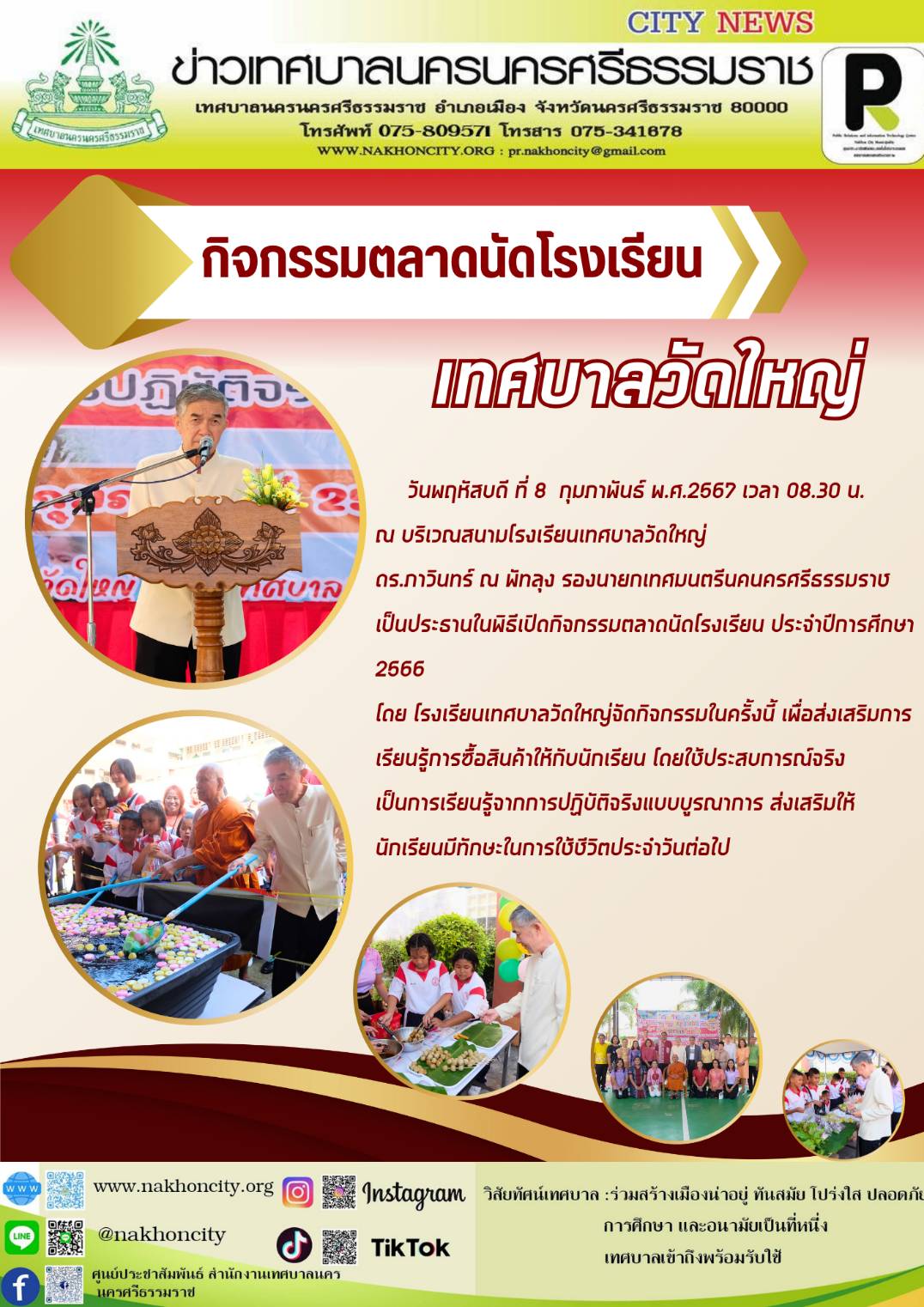 | ดร.ภาวินทร์ ณ พัทลุง รองนายกเทศมนตรีนครนครศรีธรรมราช เป็นประธานในพิธีเปิดกิจกรรมตลาดนัดโรงเรียน ประจำปีการศึกษา 2566 |